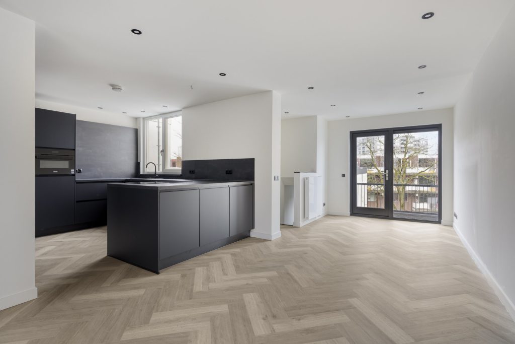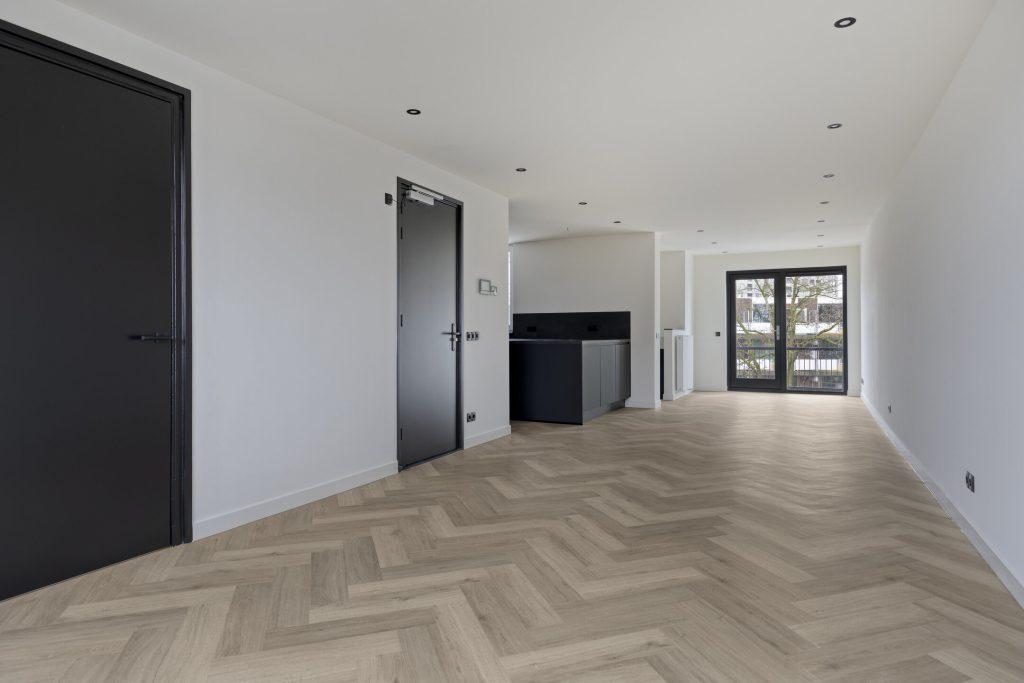 Via de gezamenlijke entree op de begane grond bereikt u dit prachtige appartement. Direct valt de hoogwaardige afwerking op: een doorlopende visgraat PVC-vloer in het gehele appartement, strak gestucte wanden en plafonds met stijlvolle inbouwspots en een moderne, rustige uitstraling die perfect past bij de luxe woonbeleving.