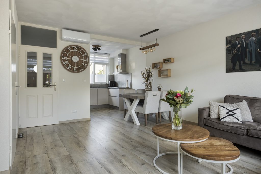 Via de entree met meterkast en toilet betreed je de lichte woonkamer met open keuken. De woonkamer is voorzien van een nette laminaatvloer, airconditioning en een handige bergkast. Grote raampartijen zorgen voor veel daglicht en een fijne sfeer.
