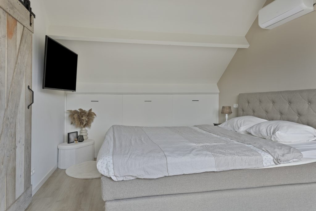 De slaapkamer is voorzien van airconditioning, knieschotten voor opbergruimte en een strakke laminaatvloer. Inbouwspots, strak stucwerk op wanden en plafonds en een moderne afwerking maken dit een heerlijke plek.
