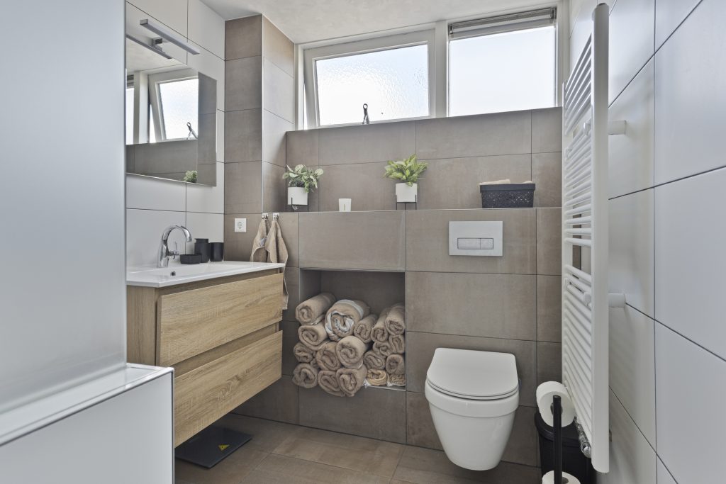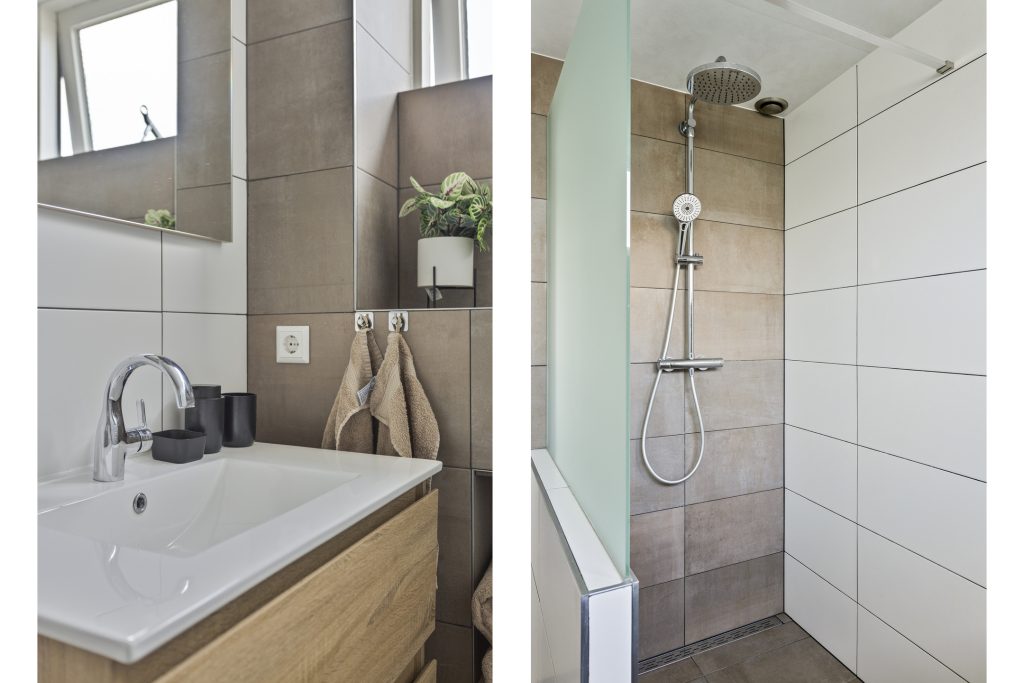 De badkamer (2020 vernieuwd) is modern en compleet: voorzien van vloerverwarming, een wastafelmeubel, toilet en inloopdouche.