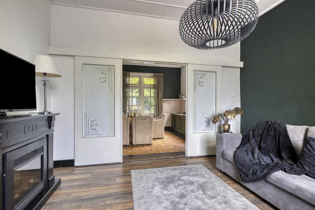 – Living voorzien van laminaatvloer, karakteristieke glas-in-loodramen, en suite deuren naar de eetkamer en elektrische haard.