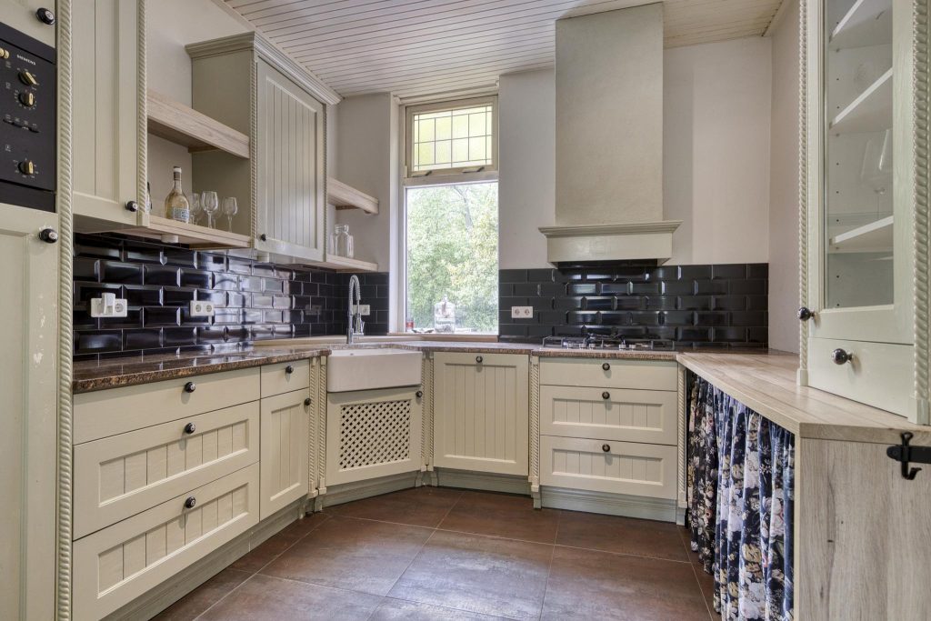– Keuken voorzien van 5-pits gasfornuis, afzuigkap, combi-oven, koelkast, dubbele spoelbak en karakteristieke glas-in-loodramen.