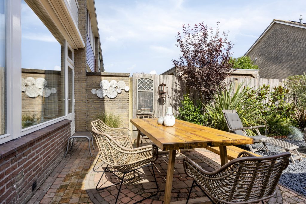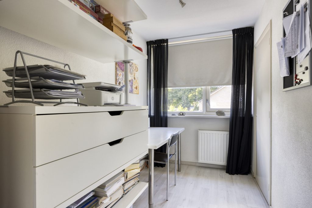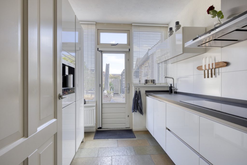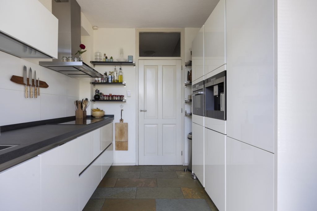 De dichte keuken is van alle gemakken voorzien, uitgerust met moderne inbouwapparatuur zoals een oven, koffiemachine, inductiekookplaat, vaatwasser en een Quooker. Middels een loopdeur heb je toegang tot de achtertuin.