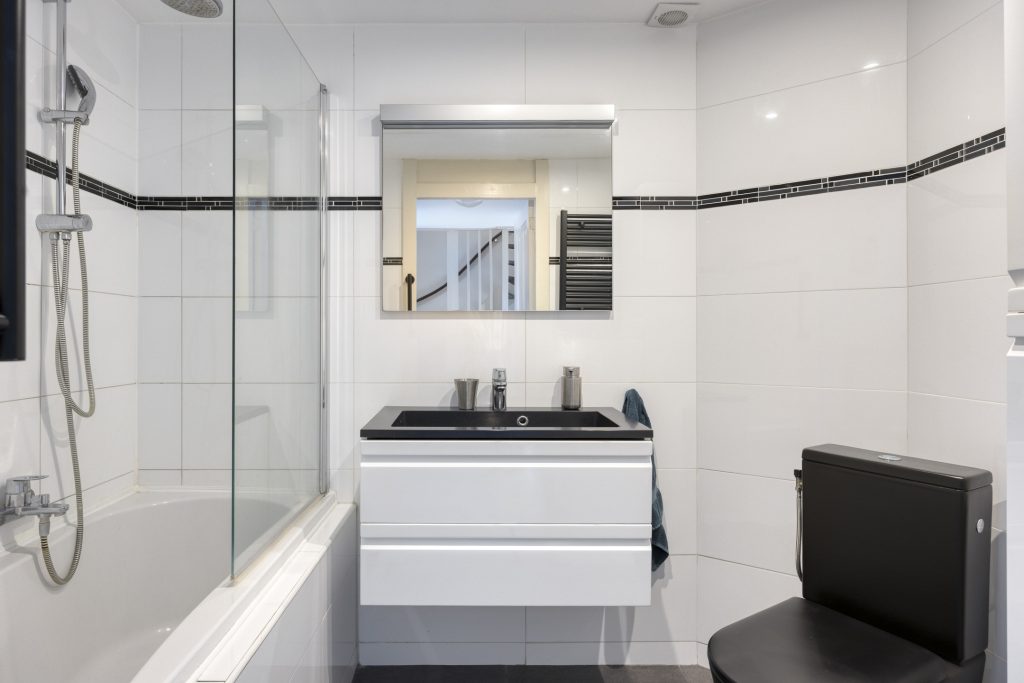 De badkamer met ligbad, toilet en wastafel in meubel biedt alle comfort.