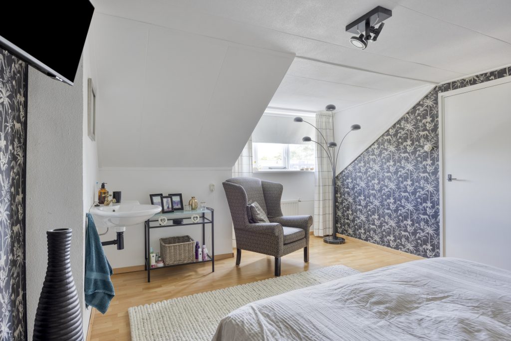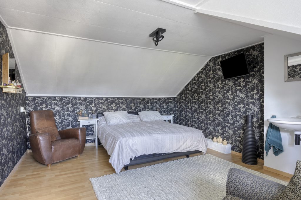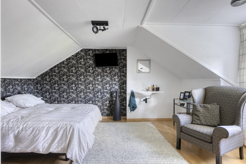 De grote zolderkamer, slaapkamer 5 is voorzien van een dakkapel en een wastafel.