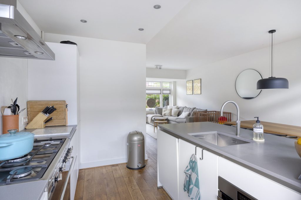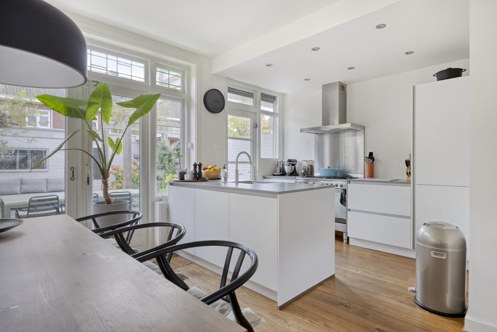 De lichte woonkamer met eikenhouten massieve vloer (2019) loopt naadloos over in de open keuken (2019), een heerlijke leefruimte voor elke dag. De keuken is volledig uitgerust: