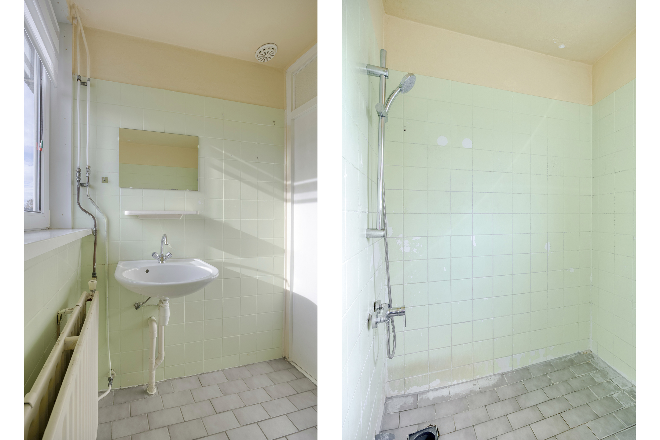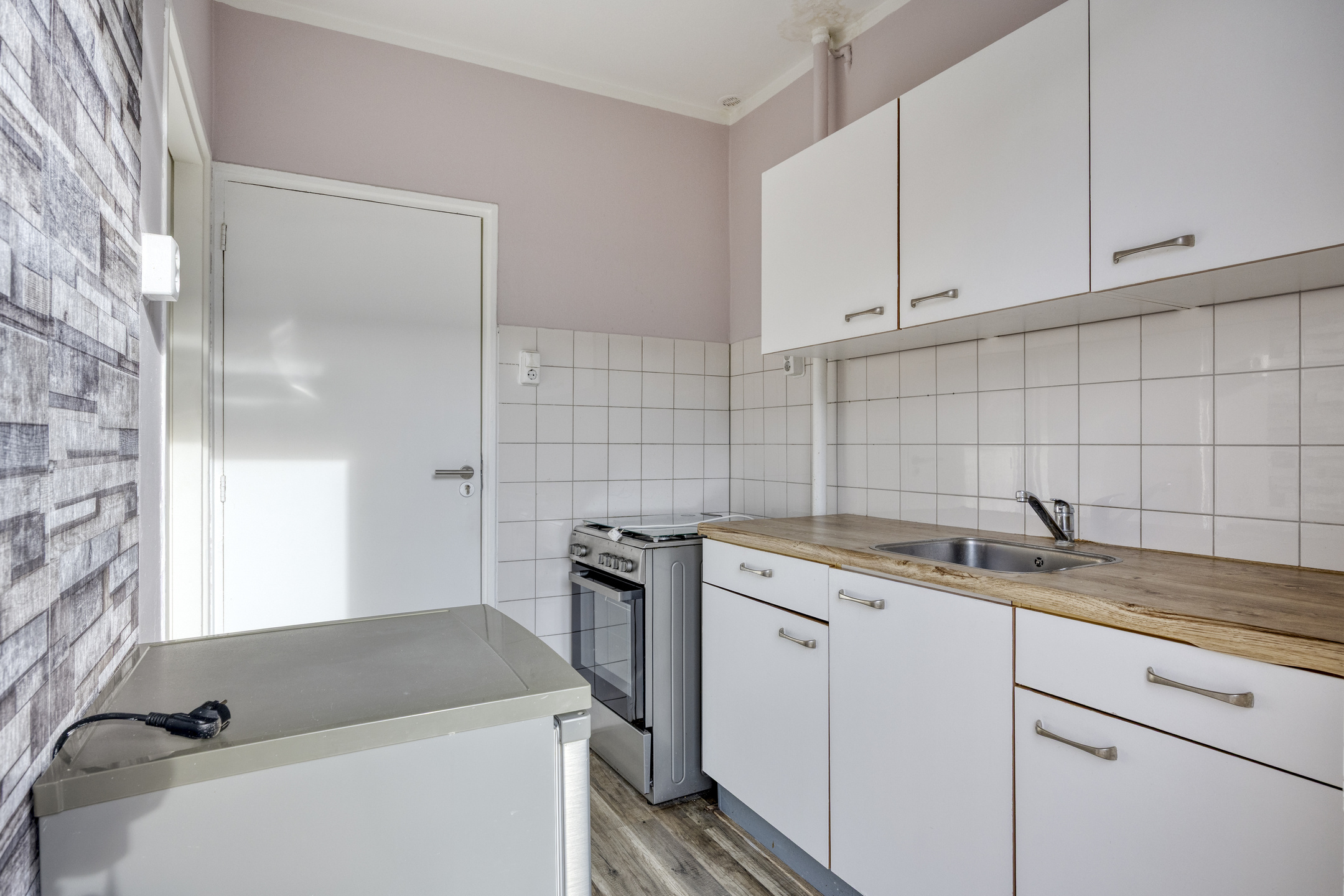 De keuken is eenvoudig uitgevoerd, voorzien van losse kookapparatuur en koelkast, met daarnaast een handige trapkast voor extra bergruimte. Vanuit de keuken bereik je de ruime lichte woonkamer op de begane grond, momenteel opgedeeld in twee kamers. Dit is eenvoudig te verwijderen om zodoende één grote open ruimte te maken.