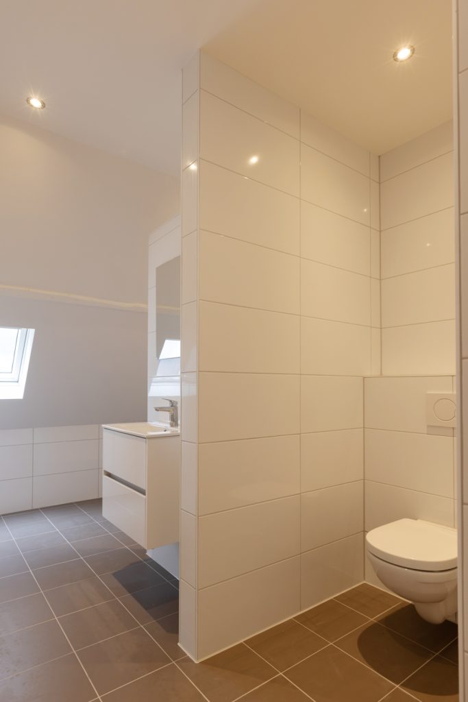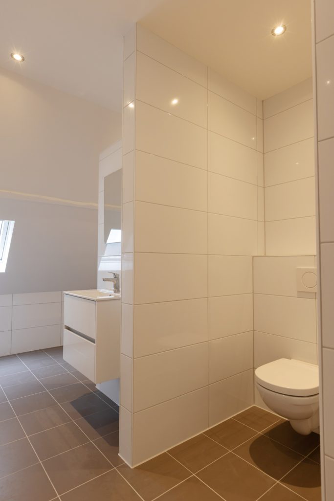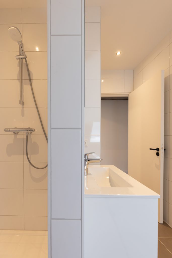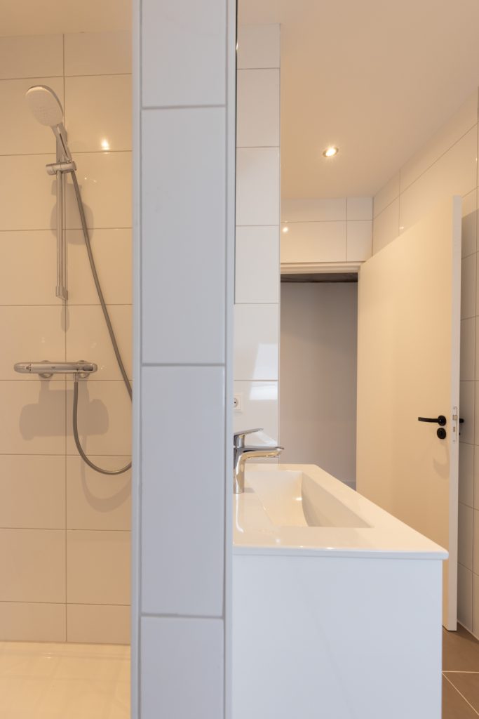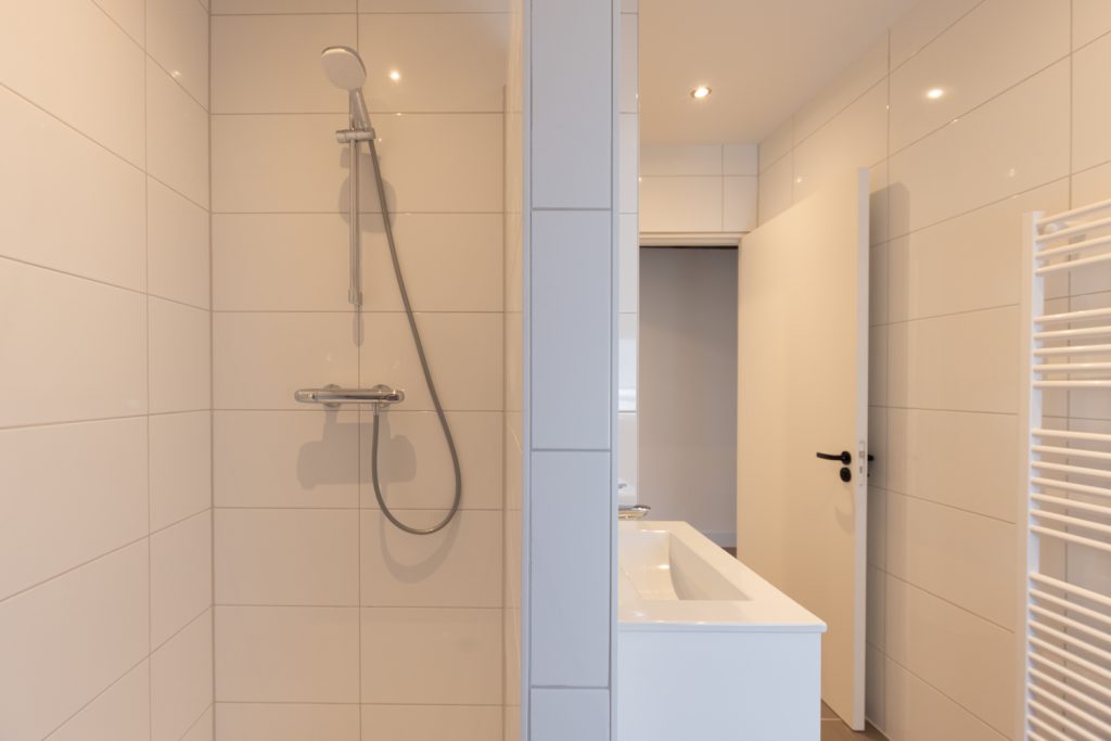 De badkamer is compact maar compleet en beschikt over een douche, wastafel, elektrische verwarming en een aansluiting voor de wasmachine.