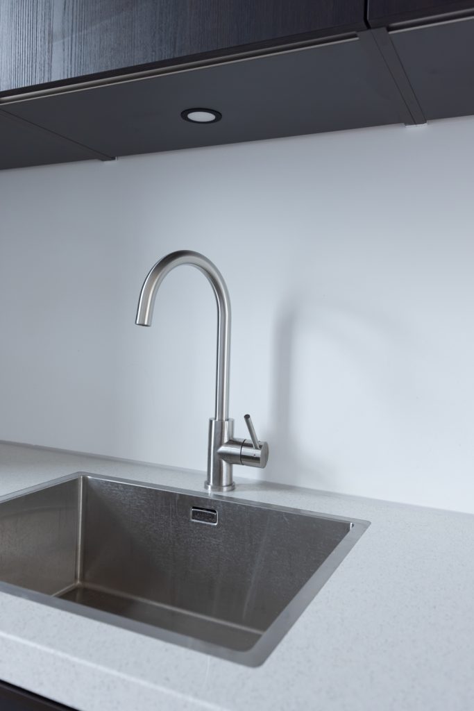 Moderne keuken welke geplaatst is in 2020 en voorzien van inductiekookplaat, combi-oven, koelkast met vriesvak, vaatwasser, wasbak, afzuigkap en laminaatvloer.
