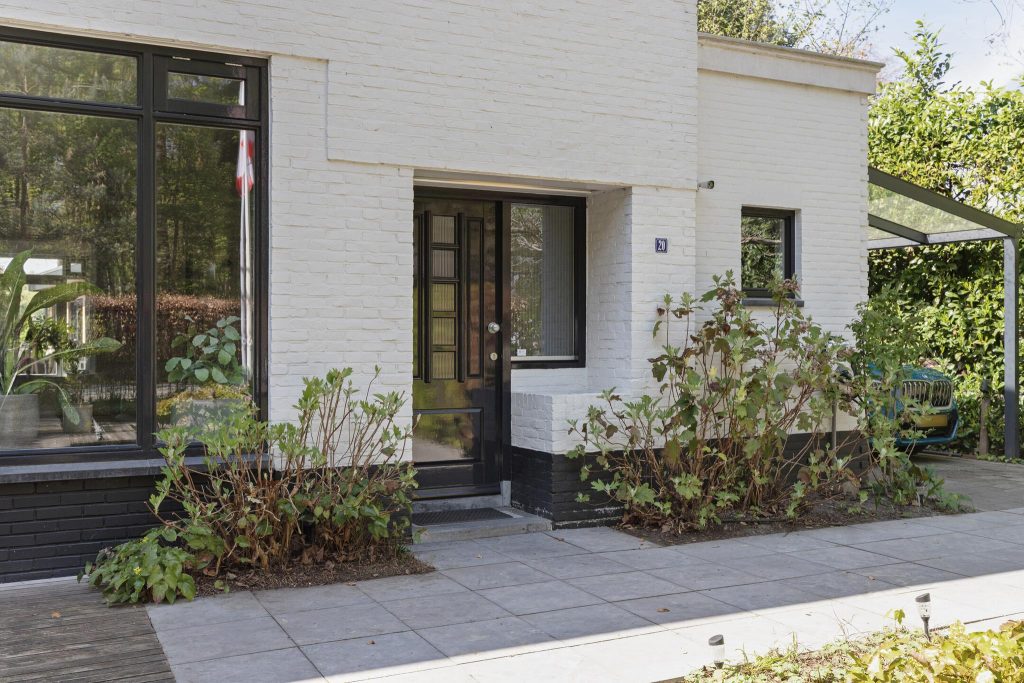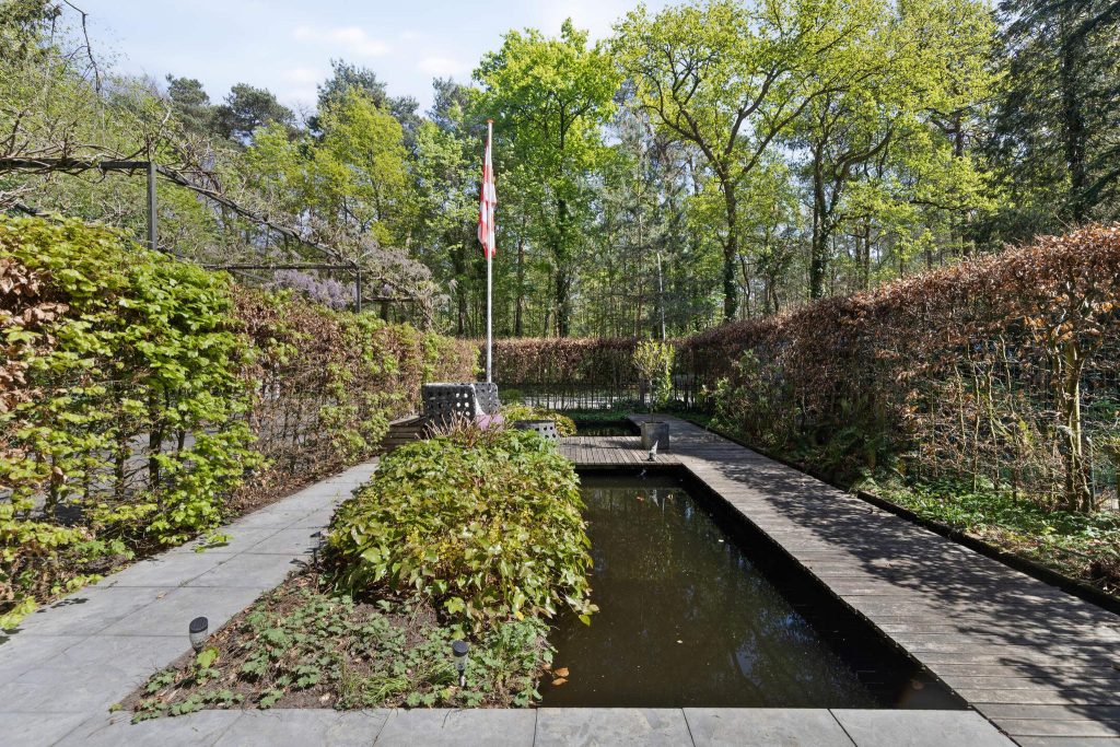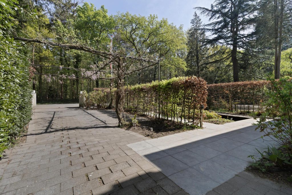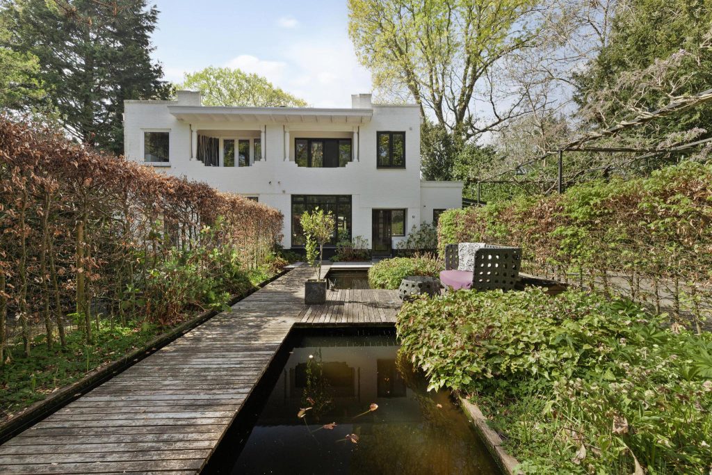 De onder architectuur aangelegde voortuin is een echte blikvanger voorzien van bestrating, een vijverpartij, een stijlvolle pergola begroeid met blauwe regen, loungehoek, vlaggenmast, elektrische poort en een aparte loopdeur.