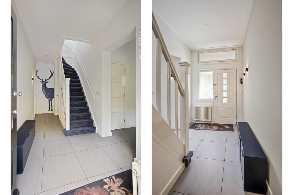 Bij binnenkomst wordt u verwelkomd door een stijlvolle ontvangsthal, waar zich een gemoderniseerde meterkast (met 3-fase), een elegant gastentoilet met fonteintje en een verdiepte trapkast bevinden.