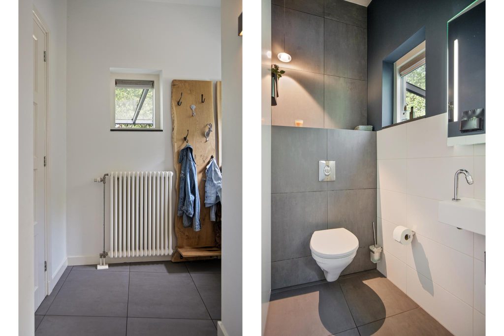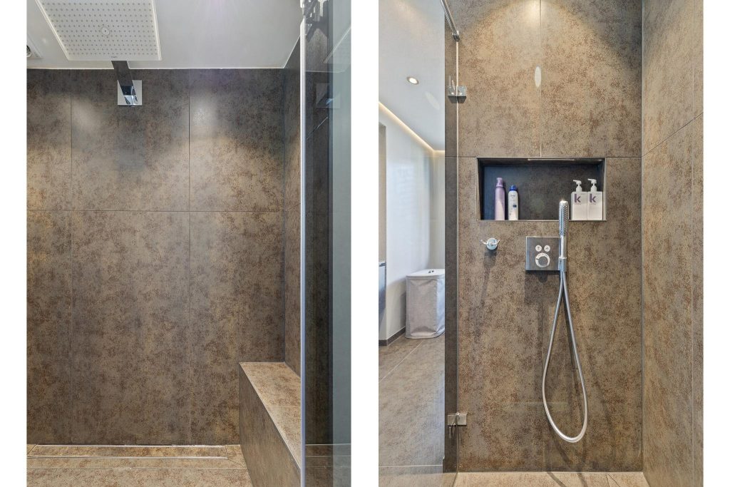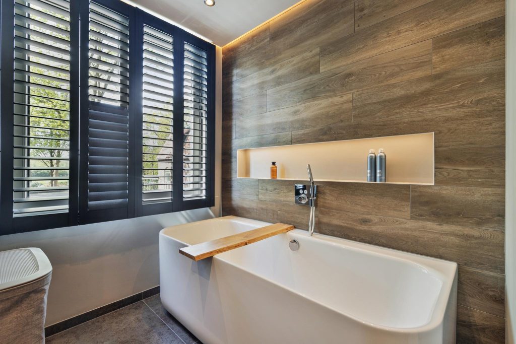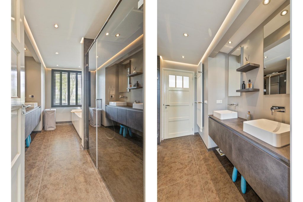 De luxe badkamer (2022) is een ware spa-beleving: voorzien van vloerverwarming, een half vrijstaand ligbad, designradiator, dubbele wastafelmeubel, mechanische afzuiging, shutters en een douche met zowel stortdouche als handdouche. De plafondspots en indirecte verlichting creëren een serene sfeer.