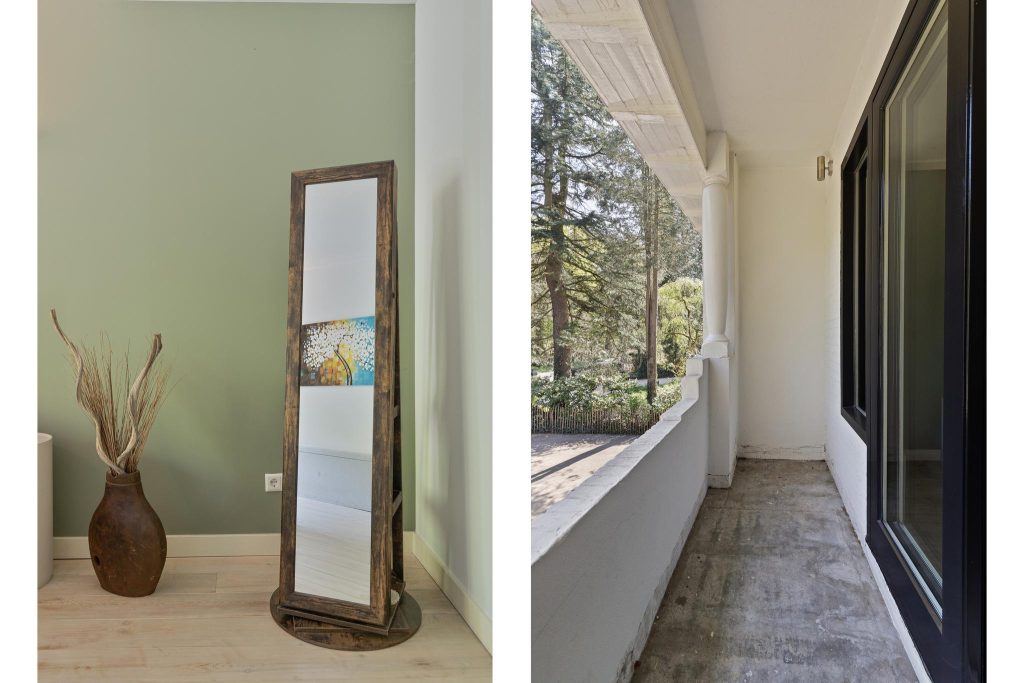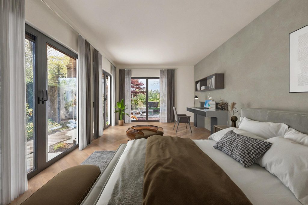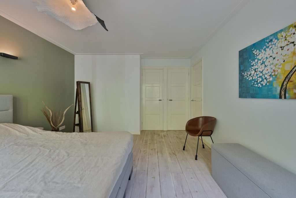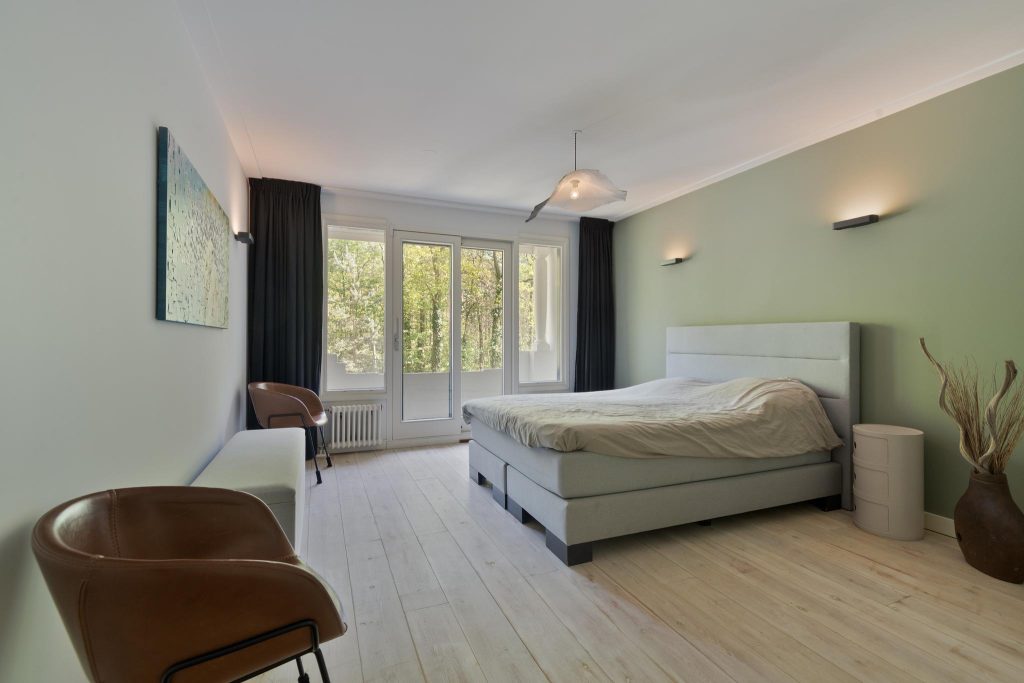Slaapkamer I, de ruime hoofdslaapkamer aan de voorzijde biedt een oase van rust en is voorzien van een schuifpui naar het inpandige balkon met uitzicht op het Mastbos, twee vaste kasten, stijlvolle wandverlichting en een houten vloer.