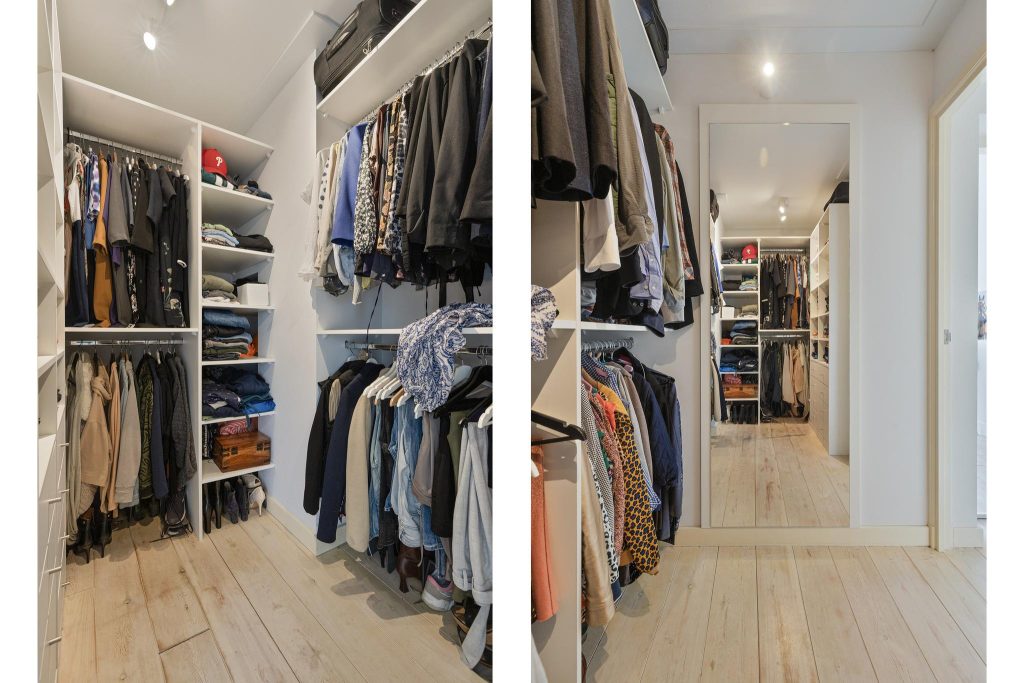 De ruime walk-in closet met opbouwspots biedt extra luxe en gebruiksgemak.