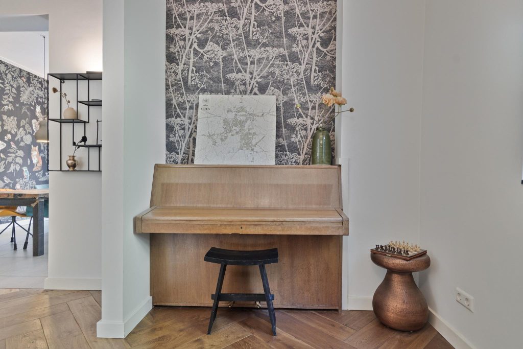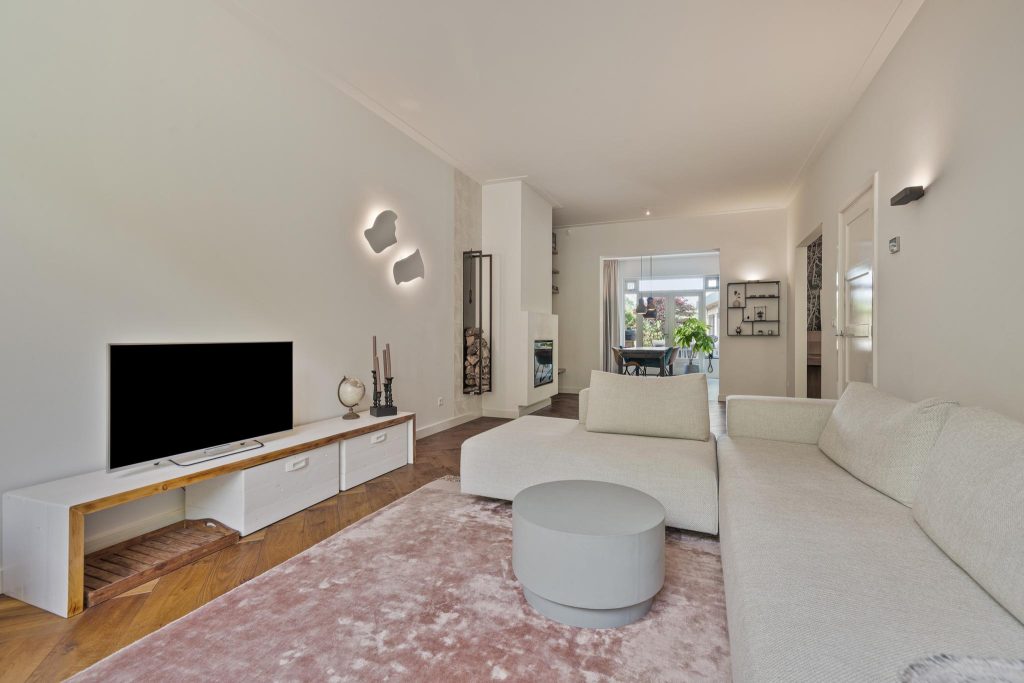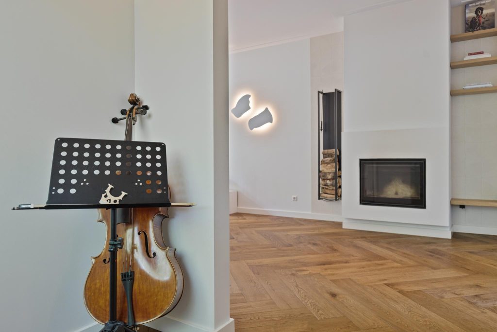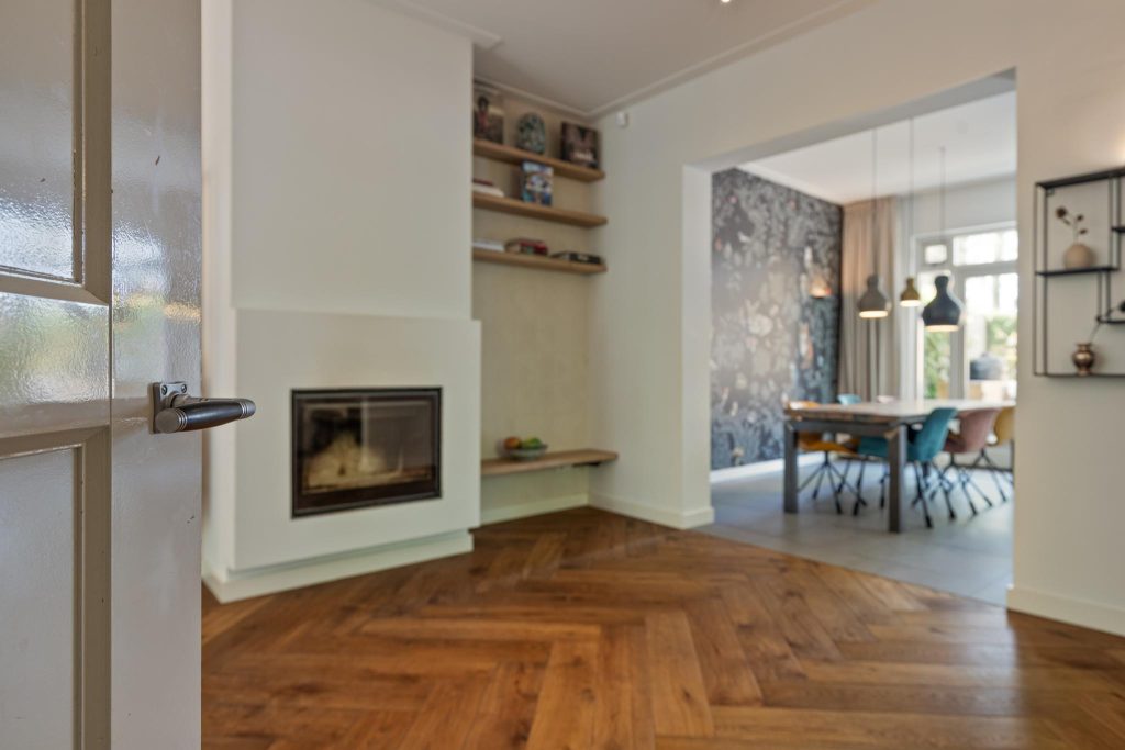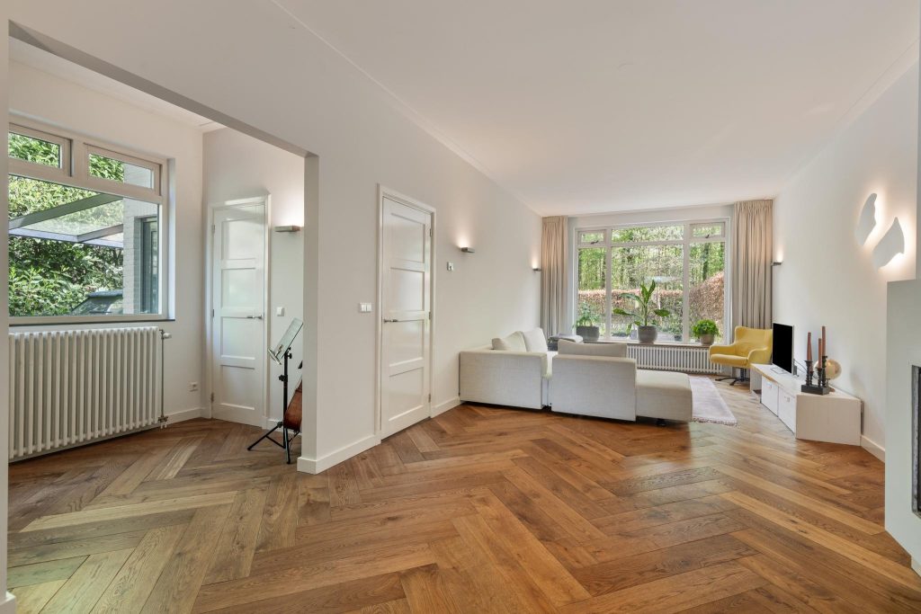 De imposante woonkamer straalt luxe uit met een houten visgraat parketvloer, sfeervolle Barbas houthaard en grote raampartijen. Aangrenzend bevindt zich een veelzijdige muziekkamer: een inspirerende plek voor creativiteit, ontspanning of thuiskantoor.