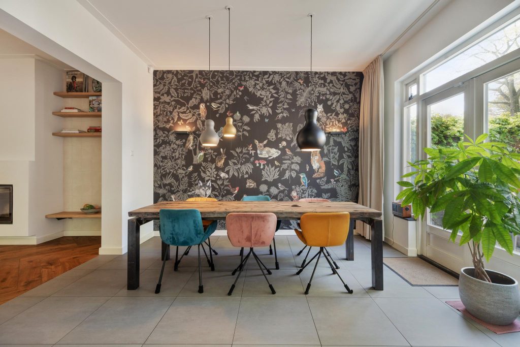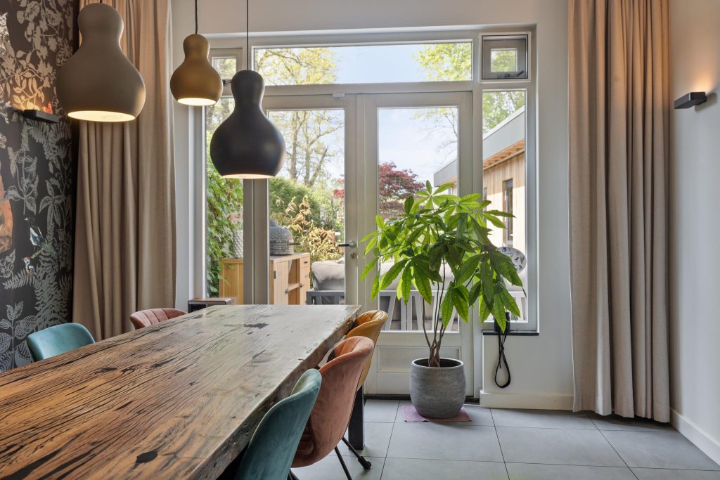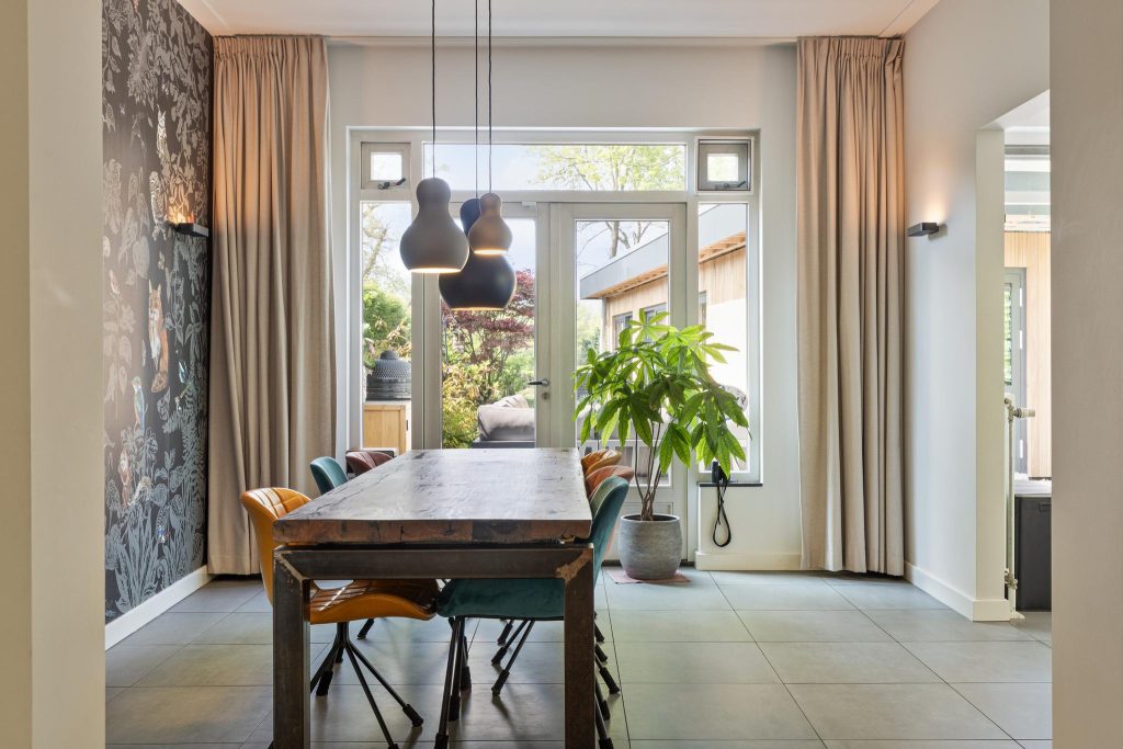 De sfeervolle eetkamer met tegelvloer en openslaande deuren naar de tuin vormt het perfecte decor voor diners met vrienden of familie. De verbinding met de tuin en het vele daglicht zorgen voor een aangename sfeer.