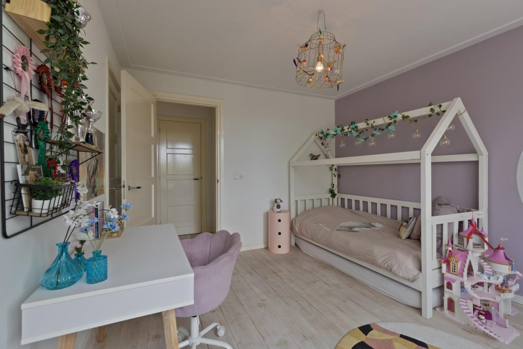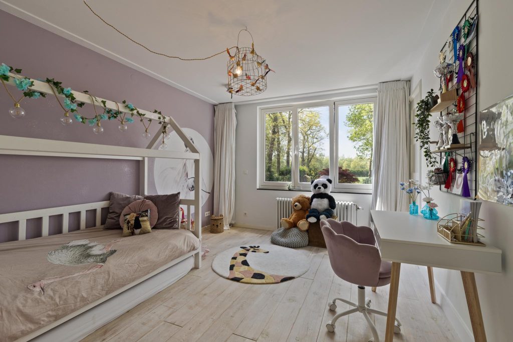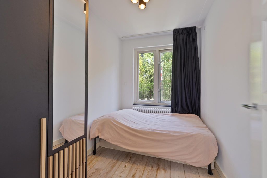 Slaapkamer II voorzijde is eveneens voorzien van een houten vloer en uitzicht op het Mastbos.