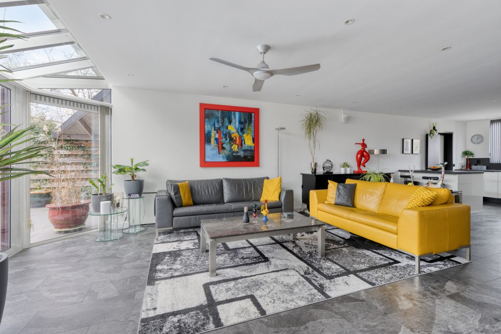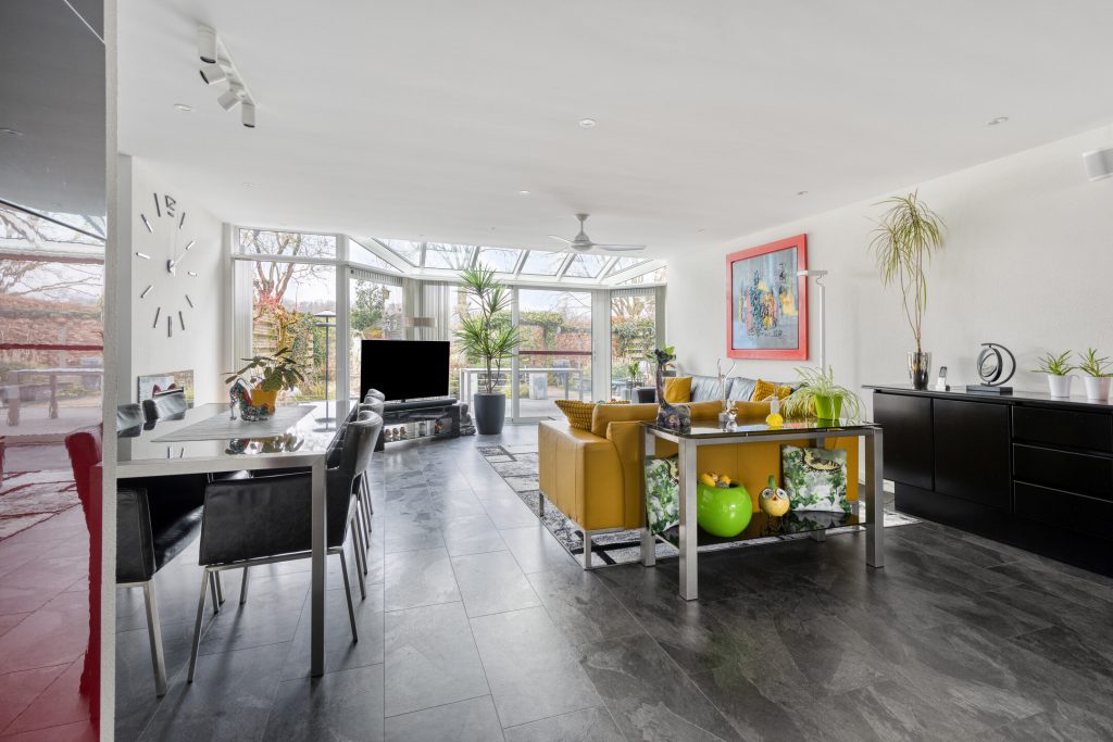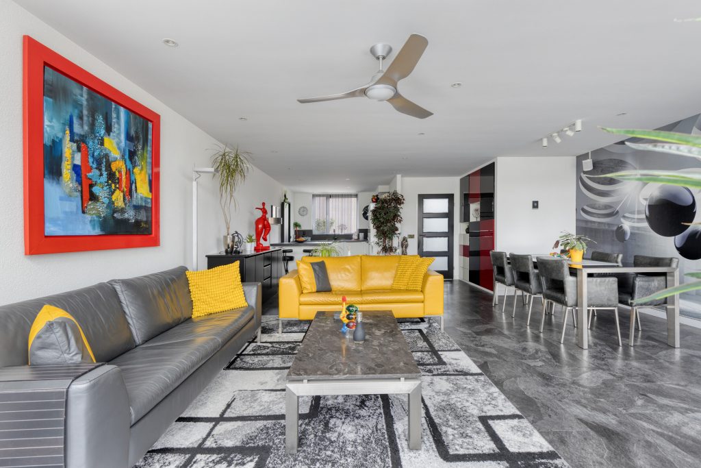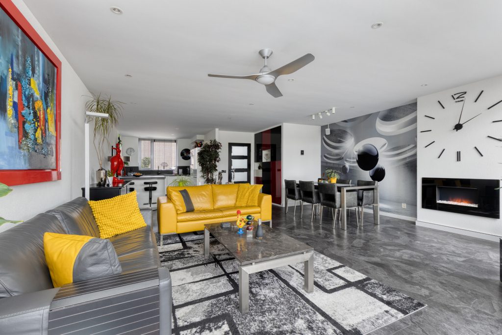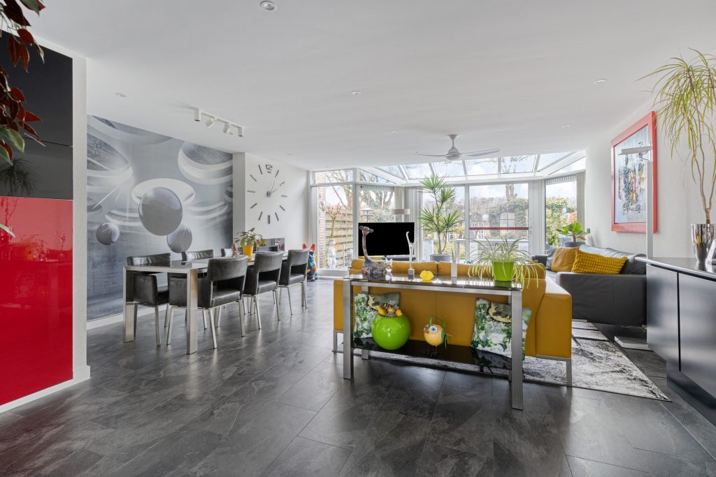 De begane grond is strak en modern afgewerkt en volledig gestuct. De PVC laminaat vloer geeft het geheel een eigentijdse uitstraling. De royale leefruimte is vergroot door de uitbouw (1996), wat zorgt voor extra licht en wooncomfort.