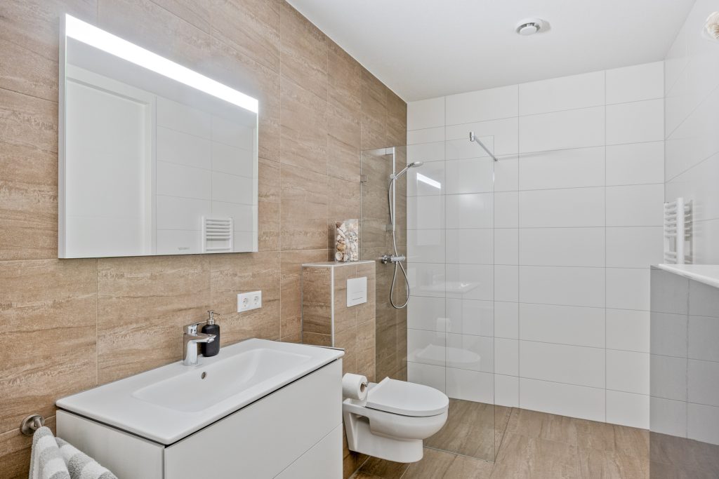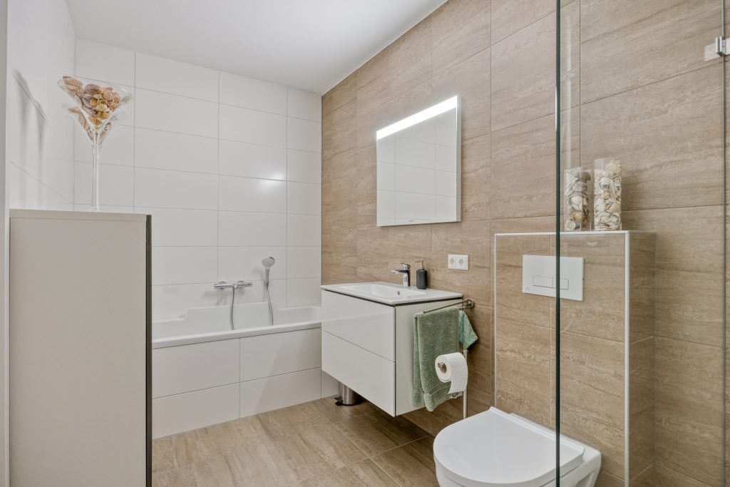 De volledig betegelde badkamer ademt luxe en comfort. De afwerking is modern en stijlvol, met hoogwaardige materialen en een warme uitstraling. U vindt hier een ruim ligbad, een royale inloopdouche met glazen wand, een strak wastafelmeubel met veel opbergruimte, een designradiator en een tweede toilet.
