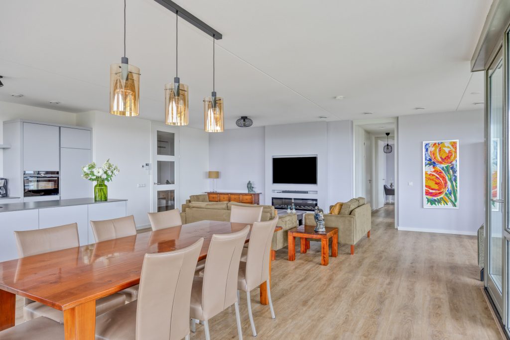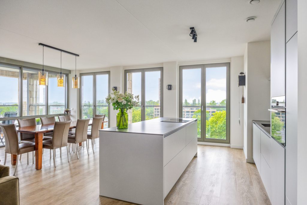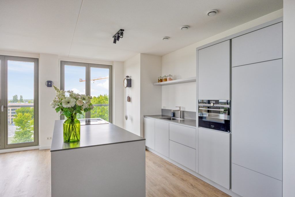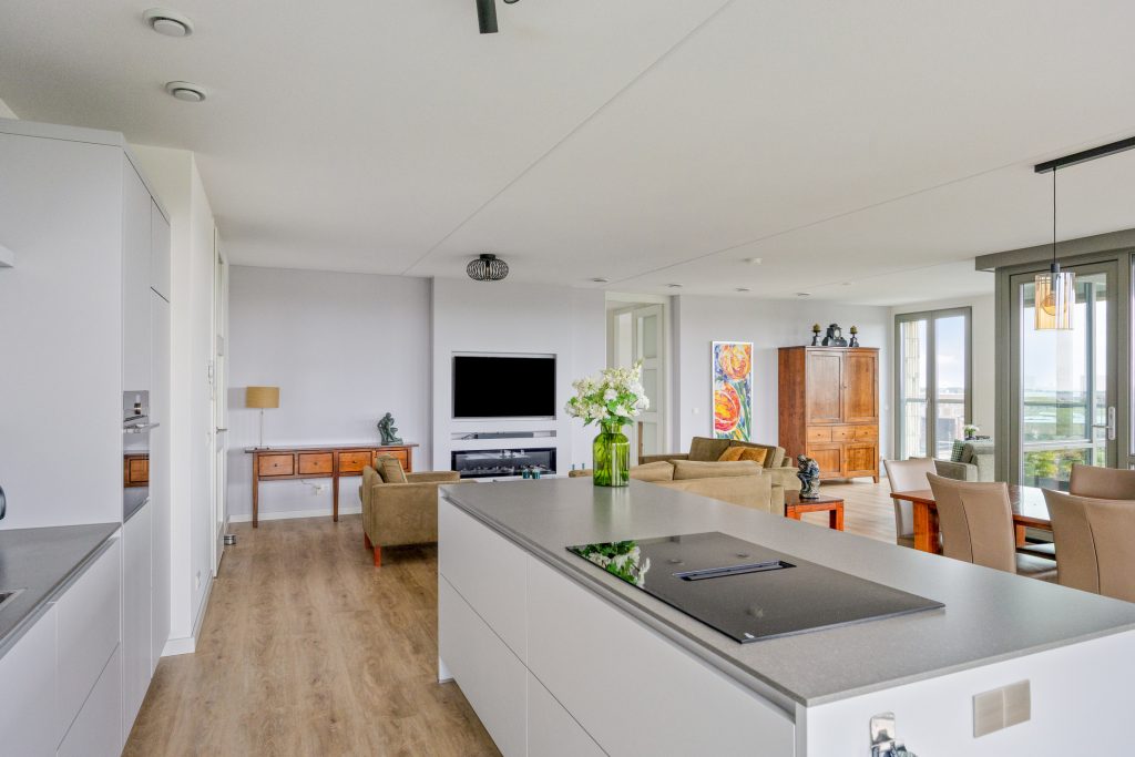 De riante living van ca. 70m² met grote kamerhoge raampartijen en een sfeervolle cinewall met haard vormt het hart van de woning. Dankzij de hoekligging geniet u hier van een overvloed aan daglicht. De woonkamer staat in open verbinding met de luxe keuken, uitgevoerd met een kookeiland en hoogwaardige inbouwapparatuur van Siemens STUDIOLINE. De keuken is voorzien van een inductiekookplaat met geïntegreerde afzuiging en kooksensor, combi-oven/magnetron, koelkast, vaatwasser en een stijlvol quartsiet werkblad met veel lades en kastruimte.