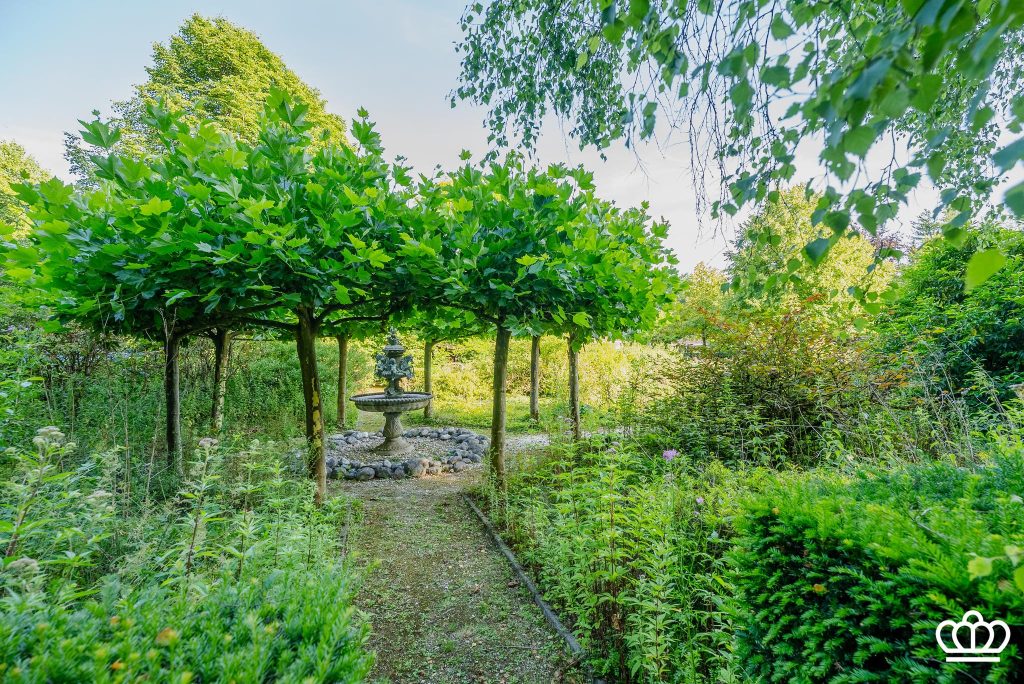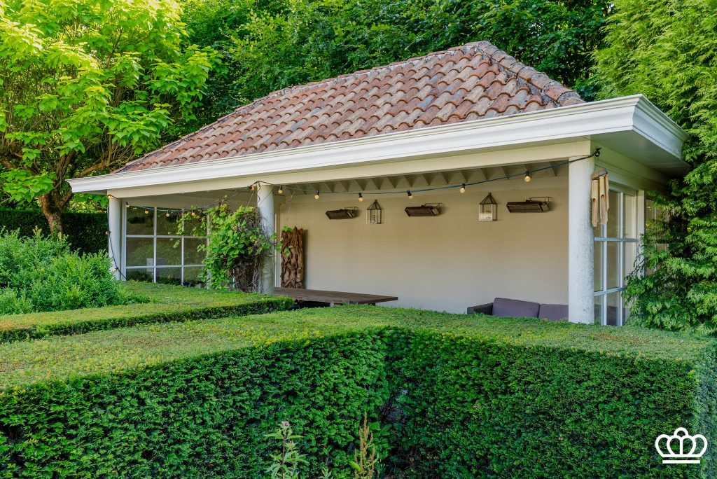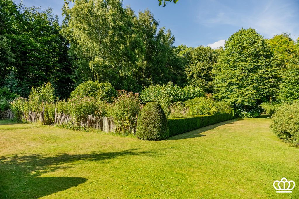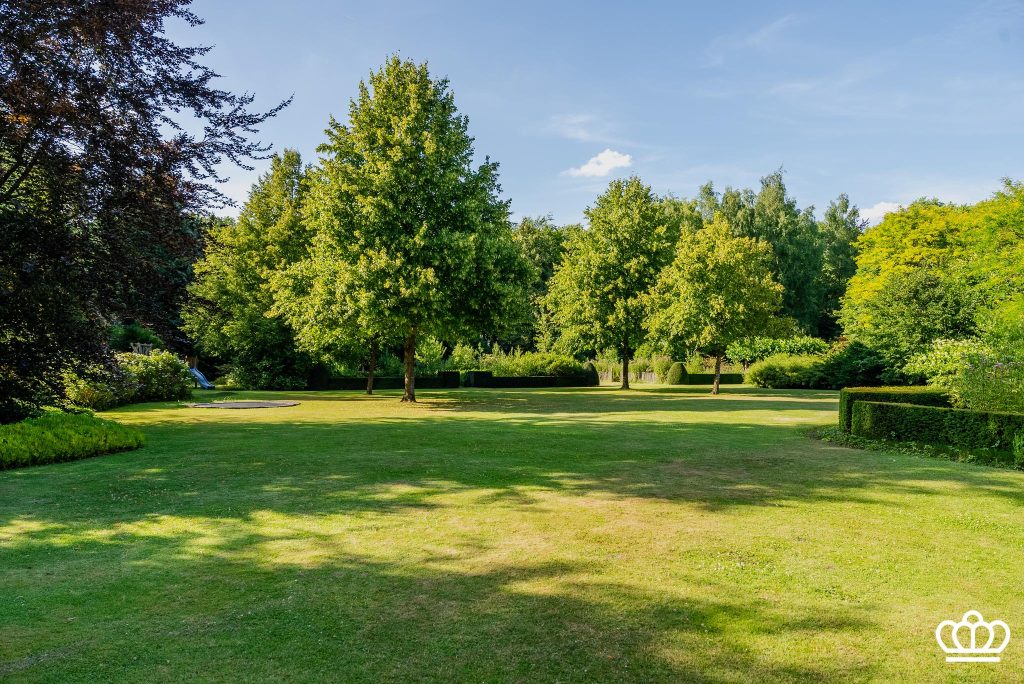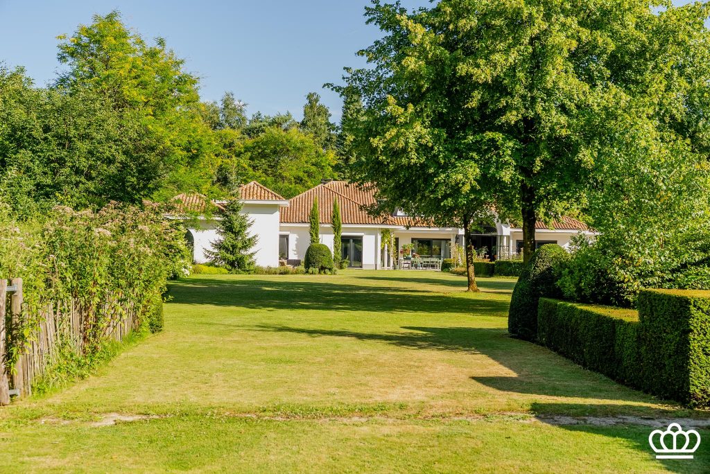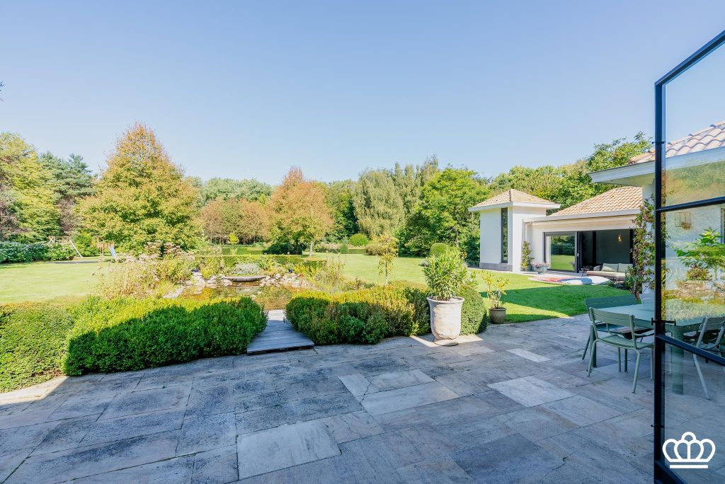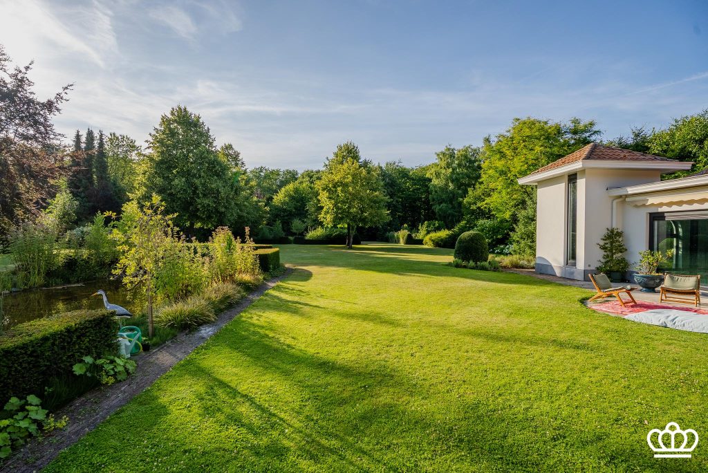 De tuin heeft een siervijver, bloementuin, fontein, tuinverlichting, beregening, etc, alle comfort is voorzien.