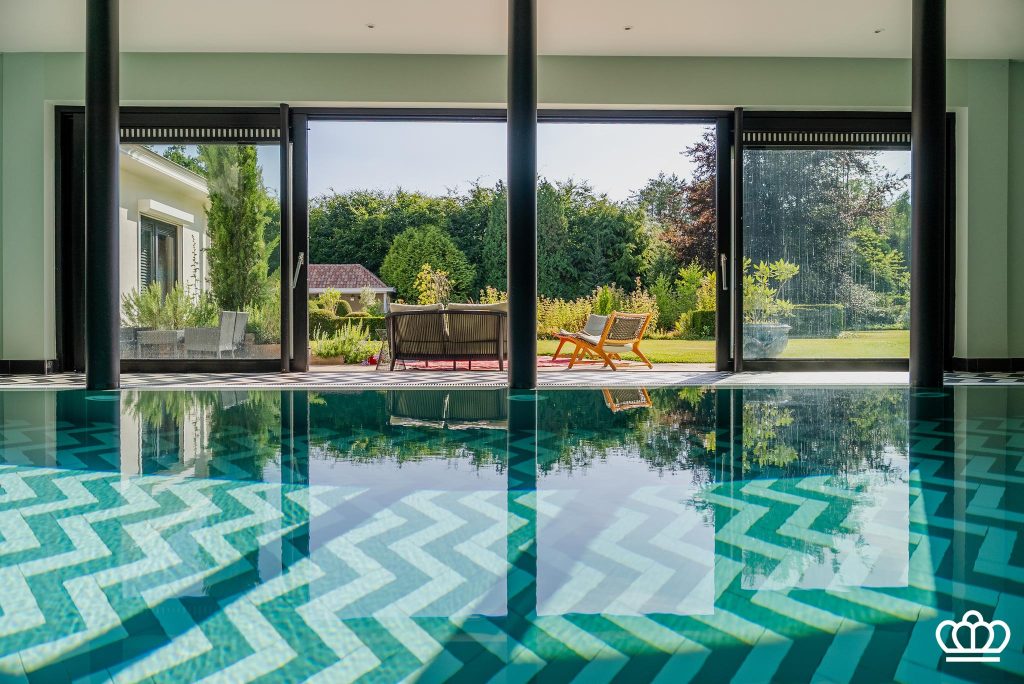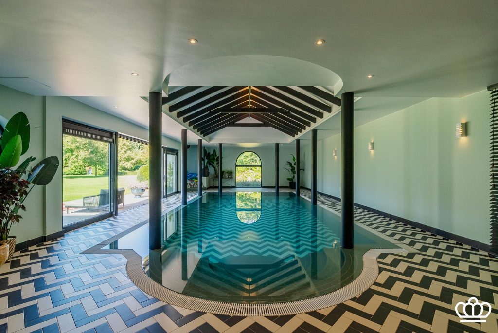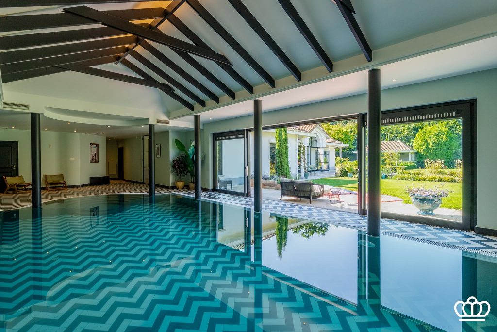 Grote ontspannings- en wellnessruimte met een inpandig overloop zwembad, jaccuzzi, stoombad, kleedruimte, sanitair etc. Vanuit de zwembadvleugel zicht en directe toegang tot de tuin en terras.