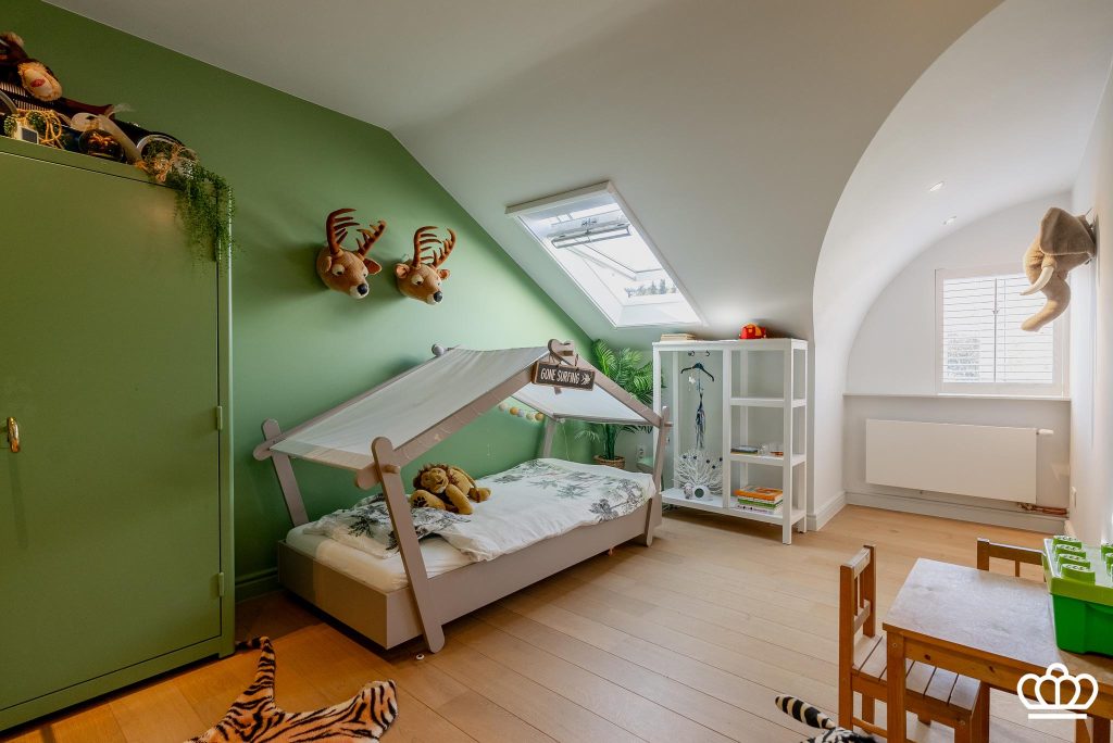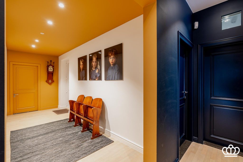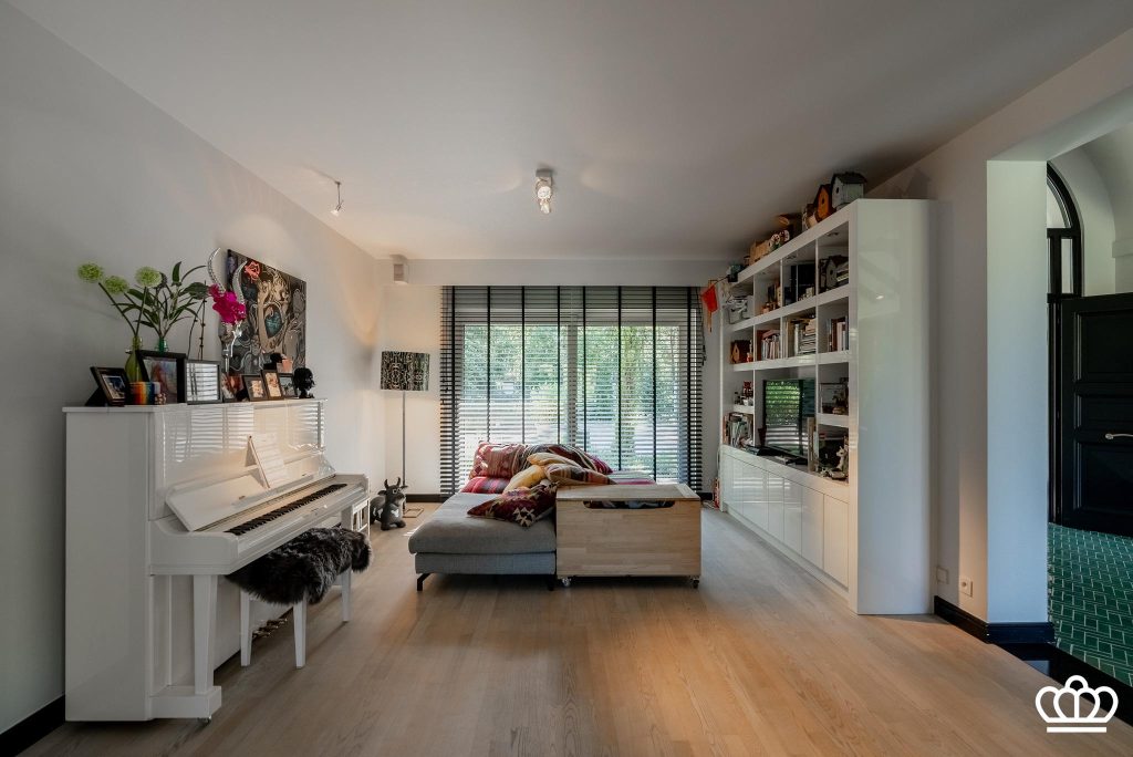Imposante entree middels een grote staal / glazen deurpartij naar de centrale open inkom die in directe verbinding staat met de leefruimte en een prachtige doorkijk biedt naar de achtertuin, aan de linkerzijde bevindt zich een ruime zitkamer met een unieke open haard en ingebouwde TV, de grote ramen bieden een mooi zicht op de tuin en een aansluitende aparte ruimte die kan dienen als TV-kamer, bureel of bibliotheek. Aan de overzijde van de zitkamer bevindt zich een moderne luxe keuken voorzien van alle hedendaagse (Gaggenau) inbouwapparatuur met een directe verbinding tot het terras. Aangrenzende eetkamer met ingebouwde kasten, momenteel in gebruik als speelkamer.
