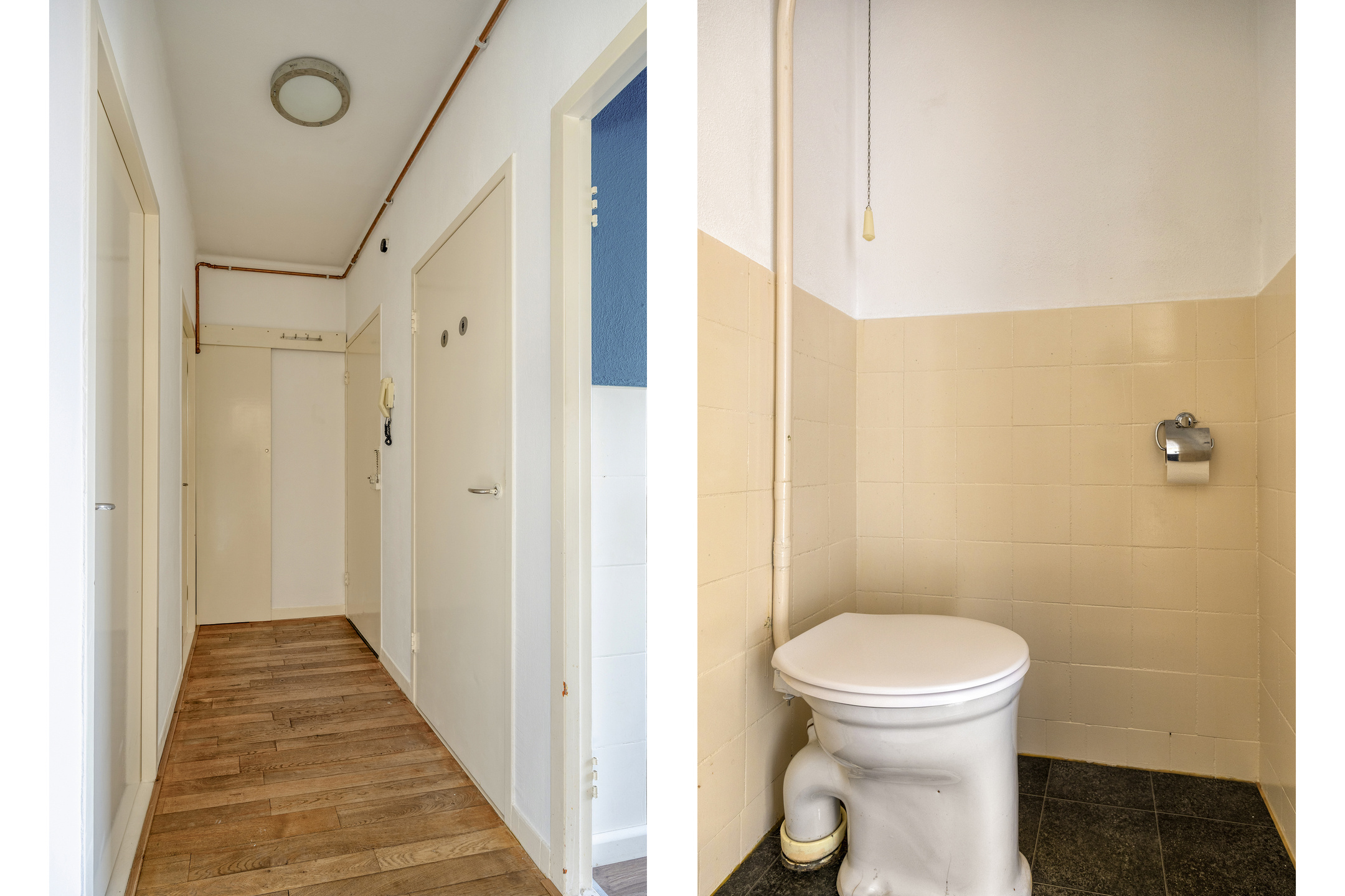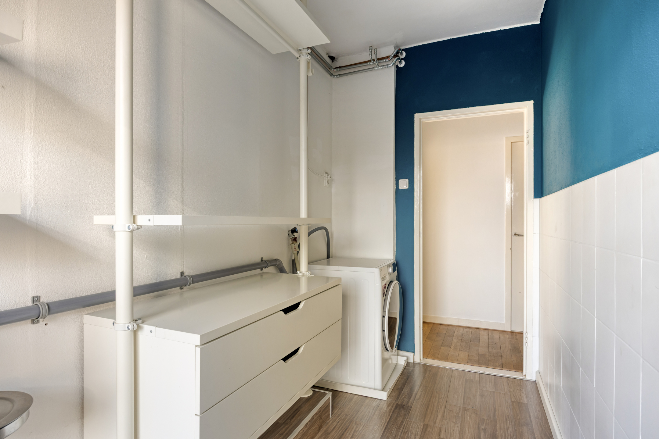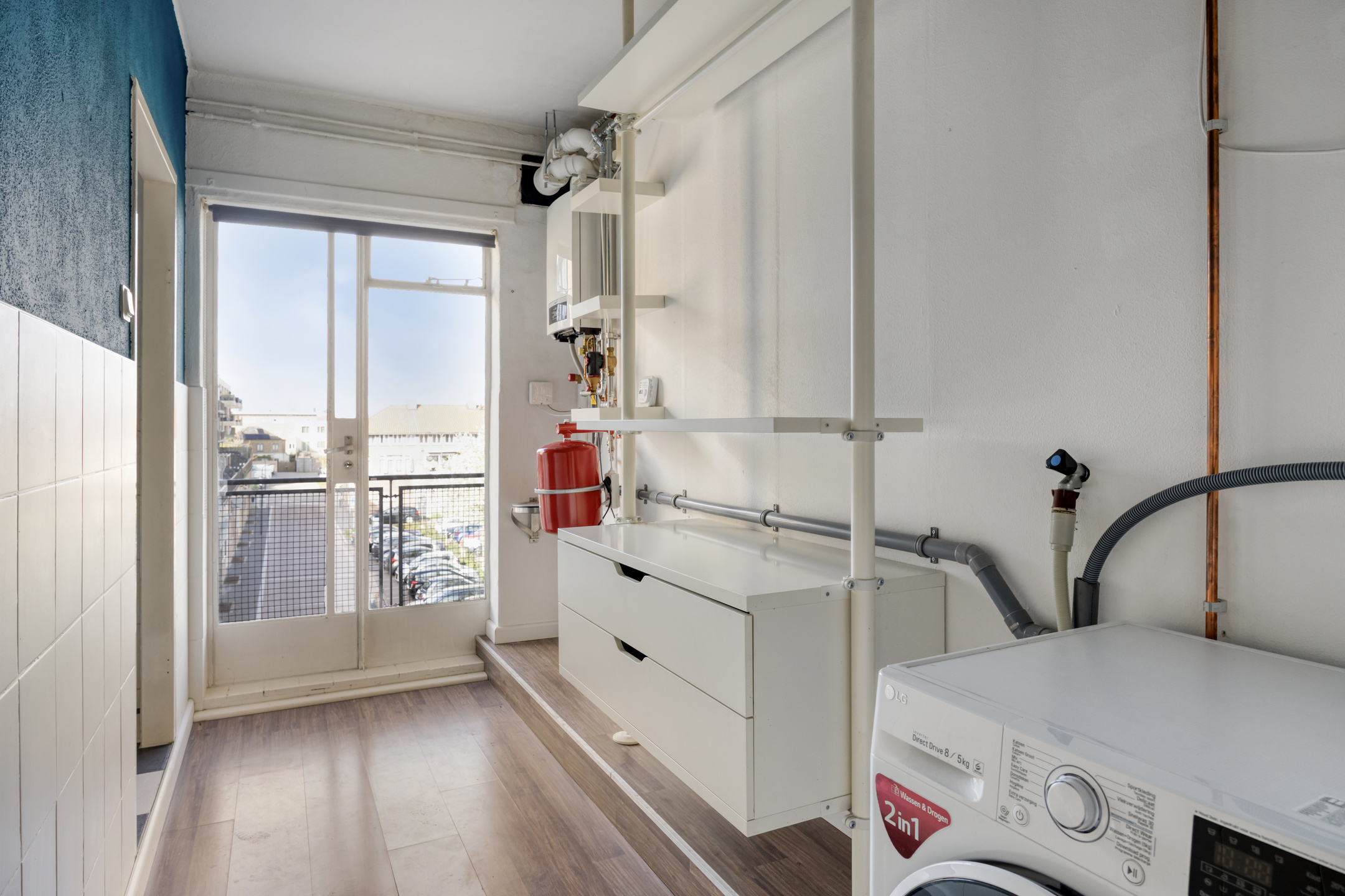 Aansluitend aan de keuken bevindt zich de bijkeuken. Hier treft u de aansluitingen voor wasmachine en droger, evenals de opstelling van de cv-installatie. Vanuit deze ruimte heeft u toegang tot zowel de badkamer als het balkon.