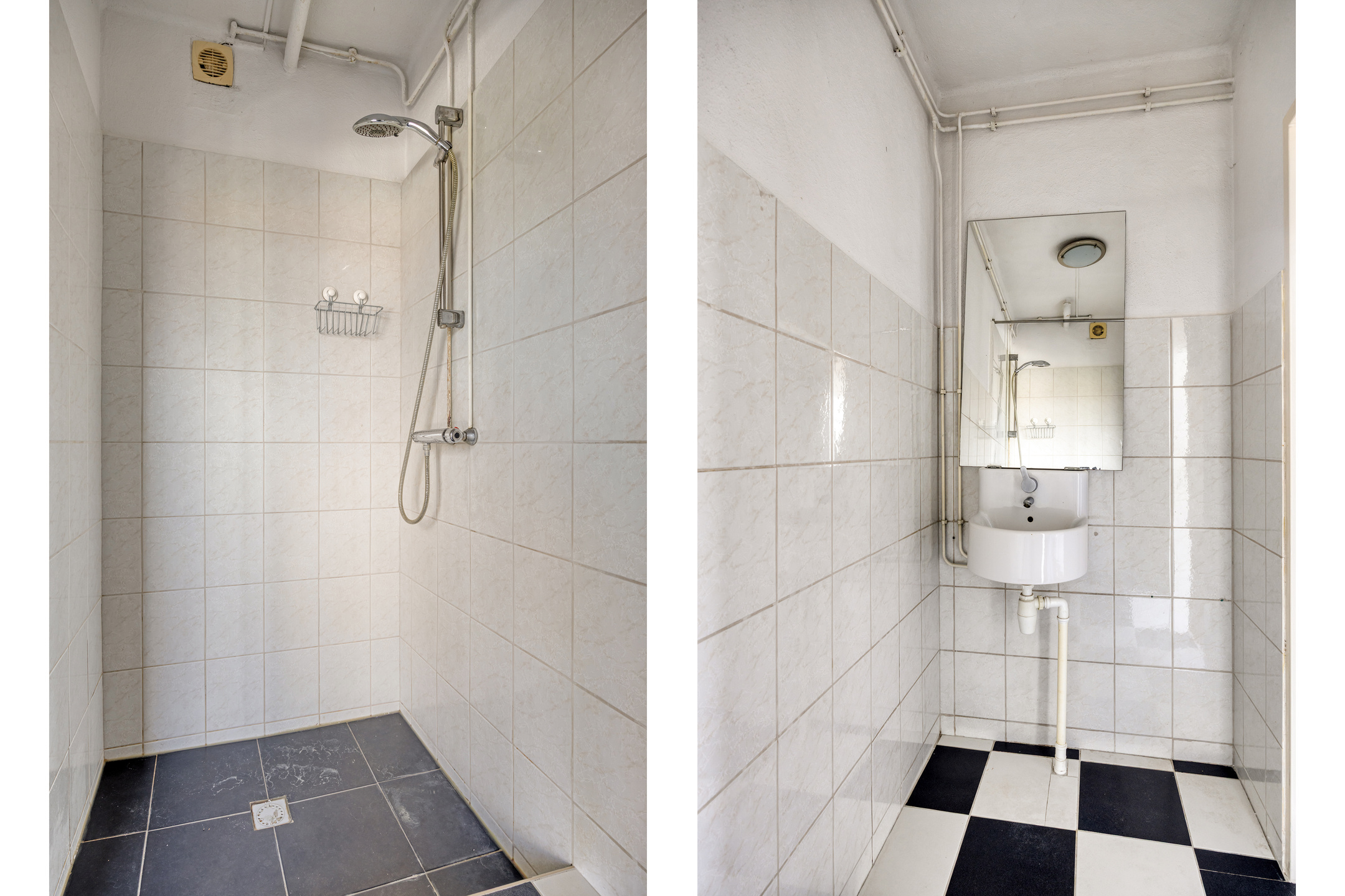 De badkamer is functioneel ingericht en voorzien van een wastafel en een douche.