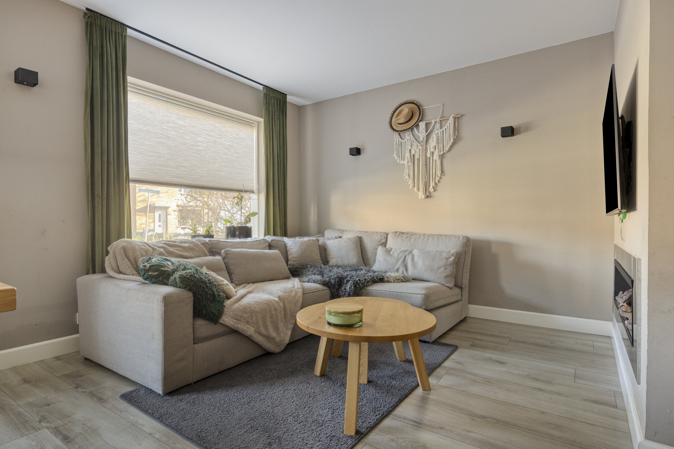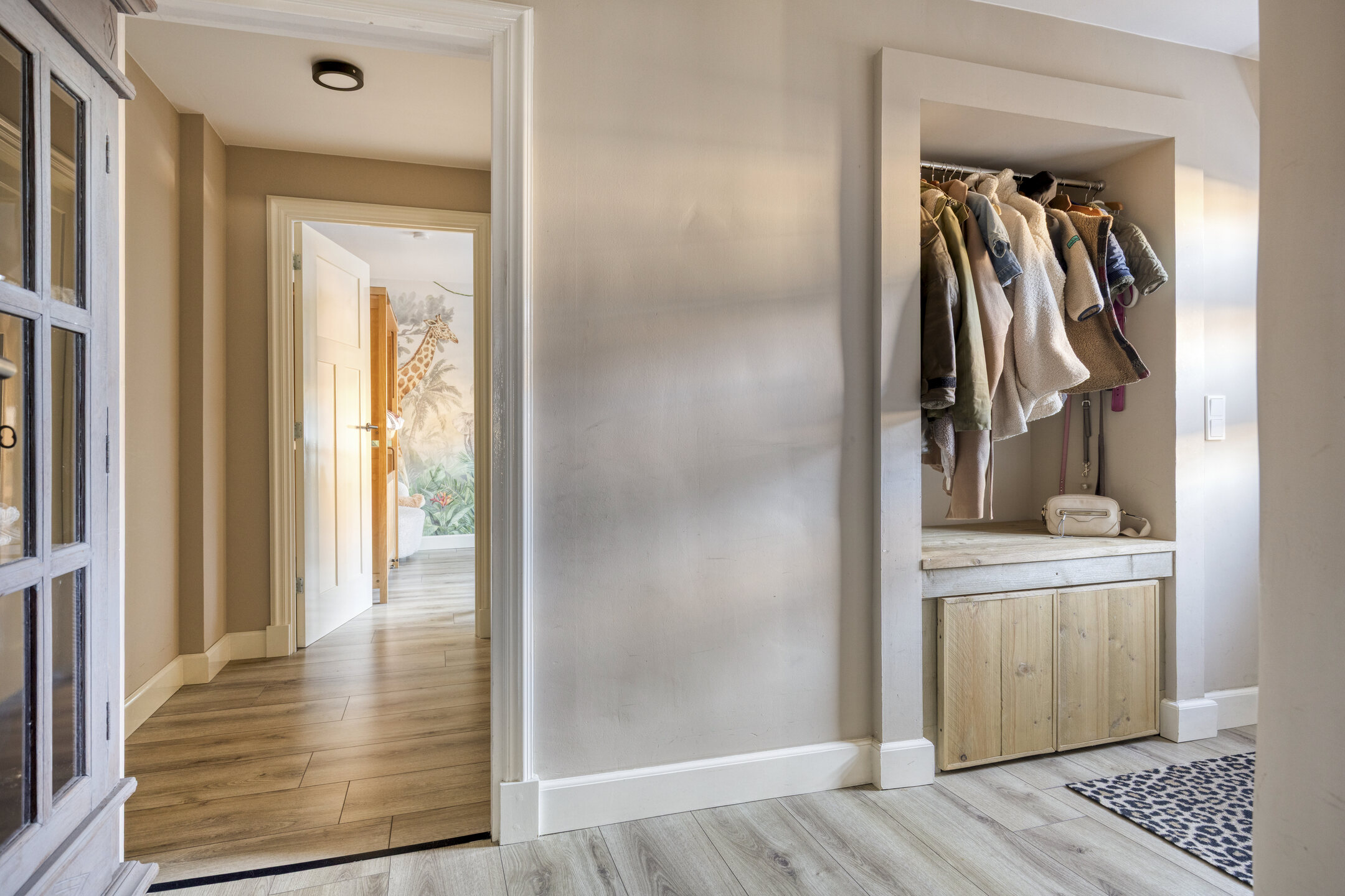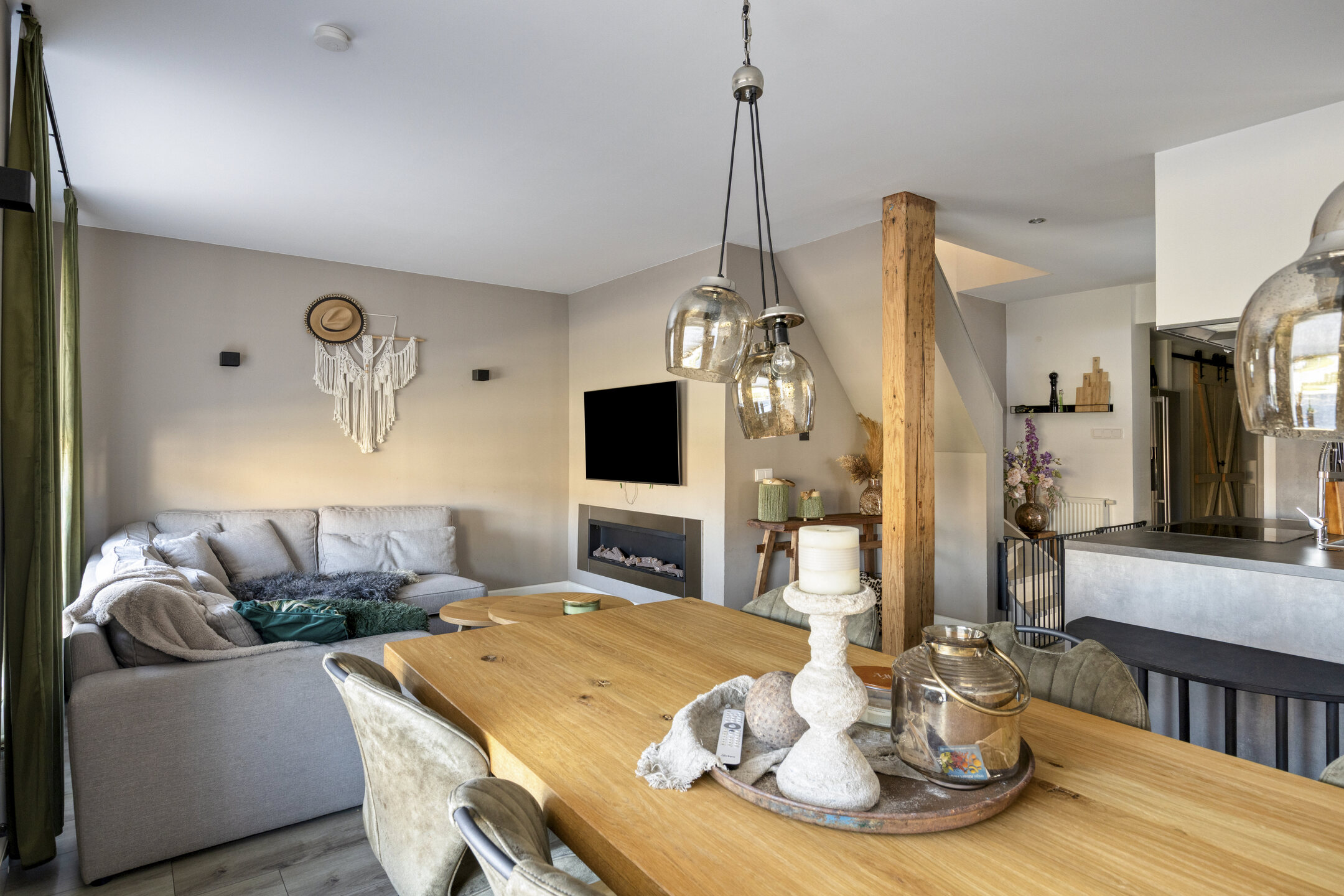 De entree aan de zijkant geeft direct toegang tot een sfeervolle hal met garderobenis, praktische opbergkast, toilet en de trap naar boven. Vanuit de hal loop je door naar de lichte woonkamer met open keuken – het hart van het huis.