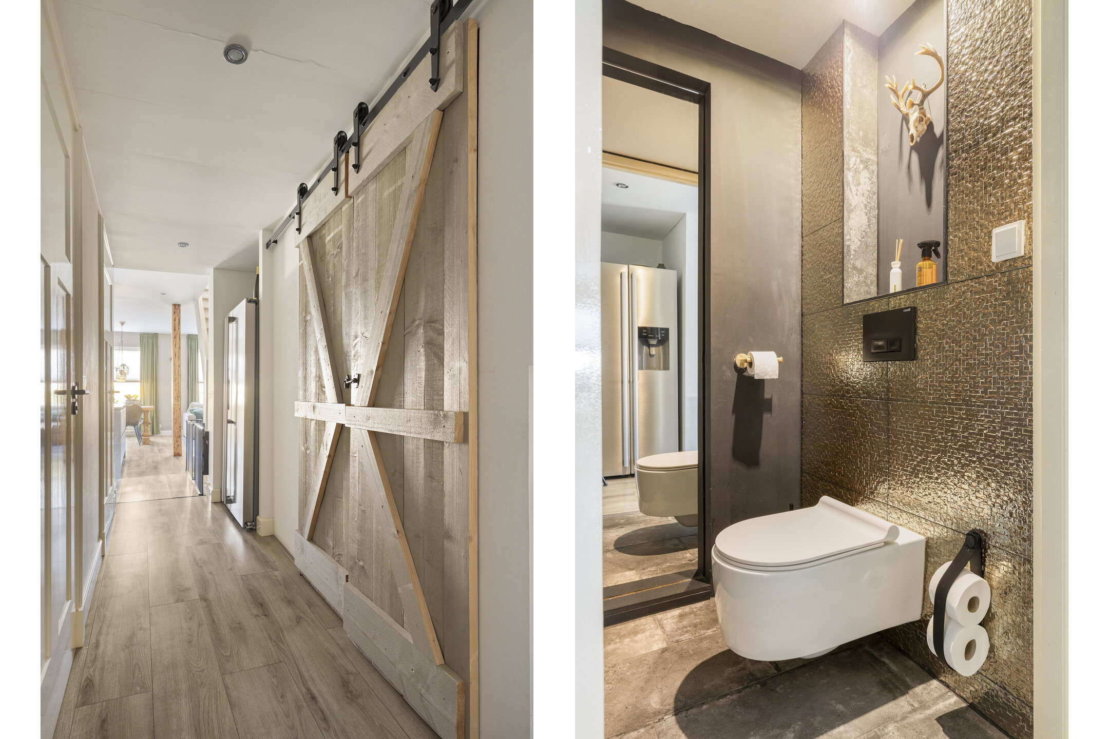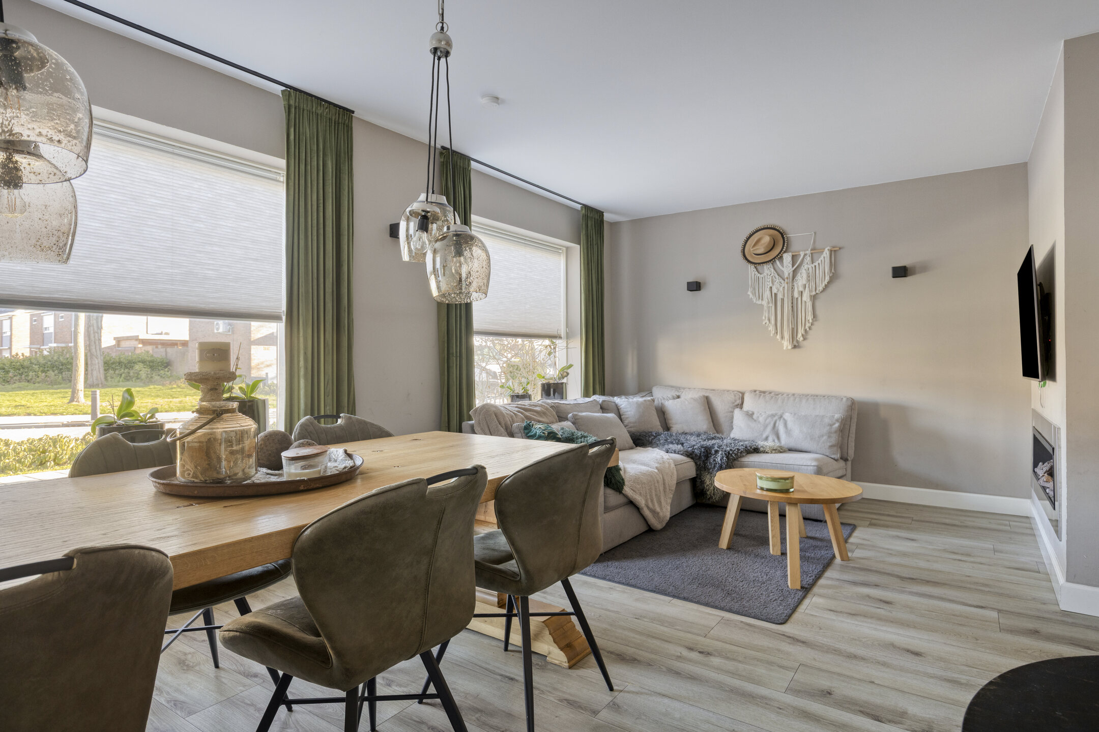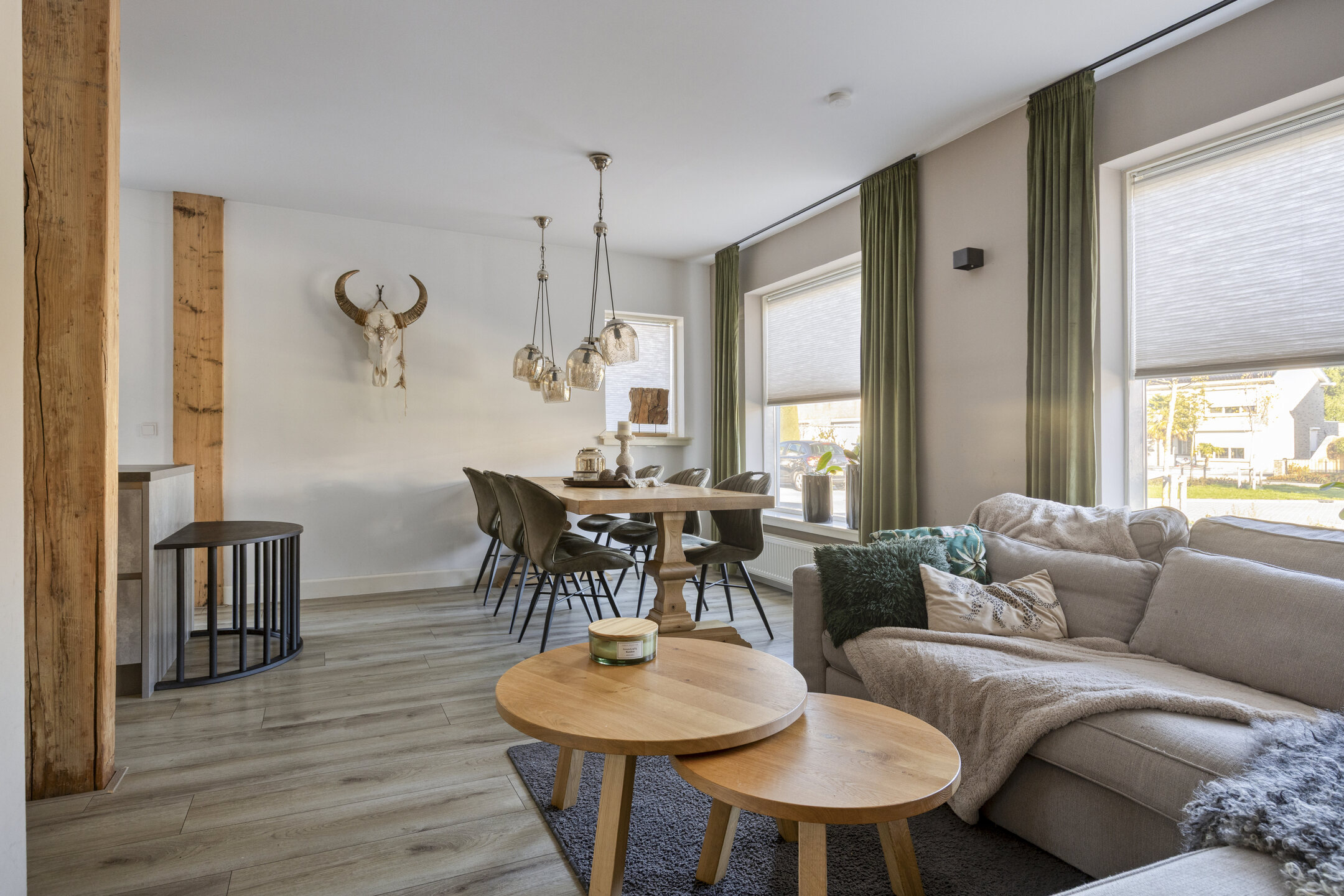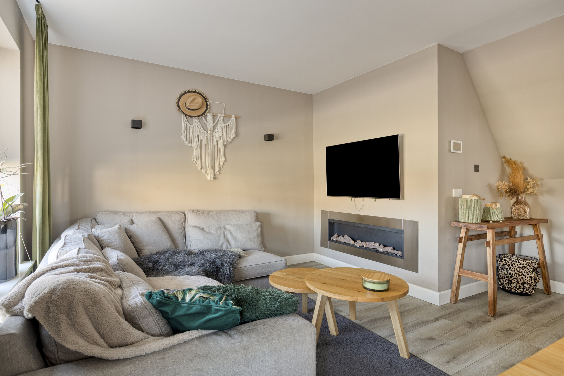 De entree aan de zijkant geeft direct toegang tot een sfeervolle hal met garderobenis, praktische opbergkast, toilet en de trap naar boven. Vanuit de hal loop je door naar de lichte woonkamer met open keuken – het hart van het huis.