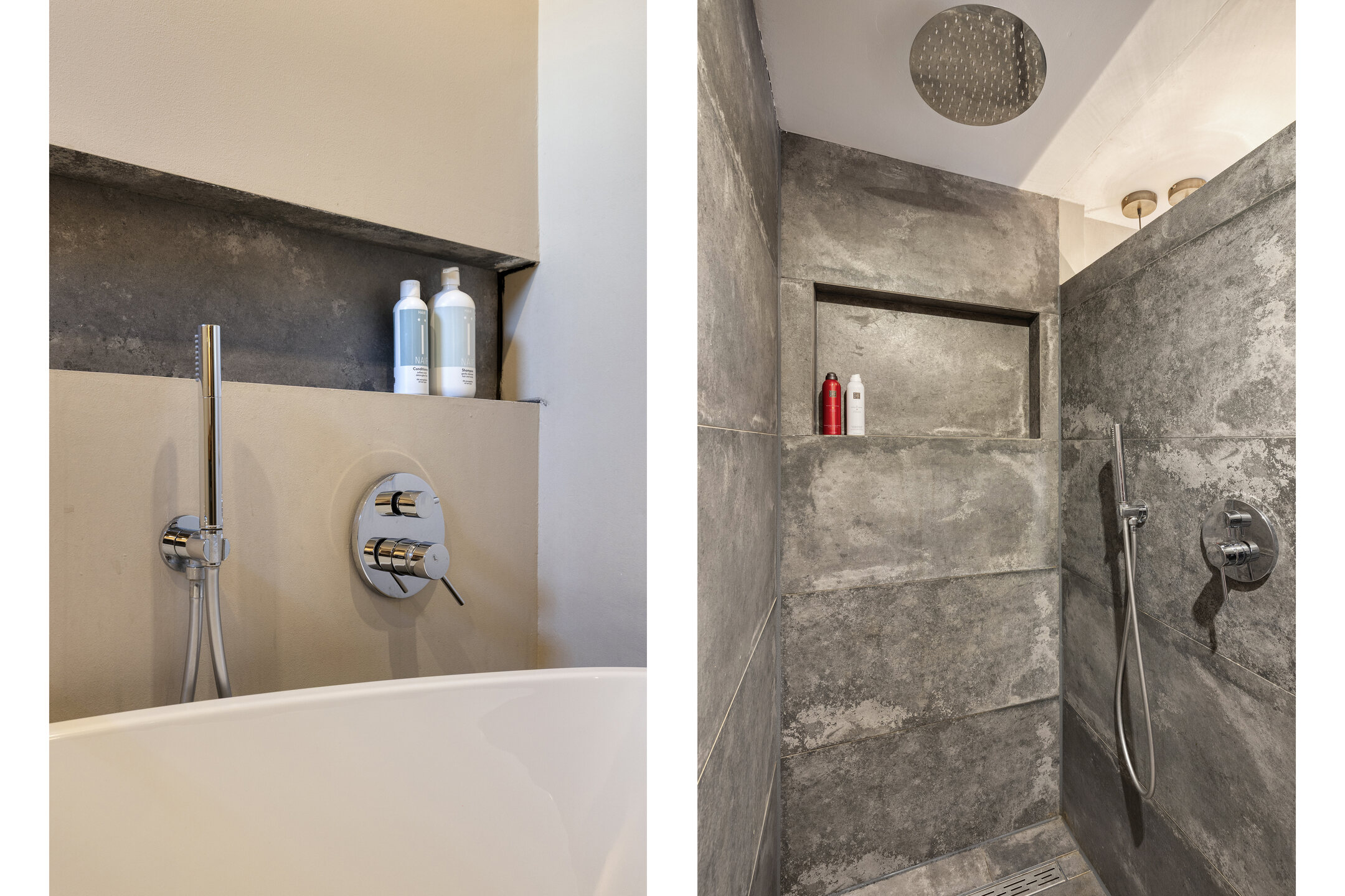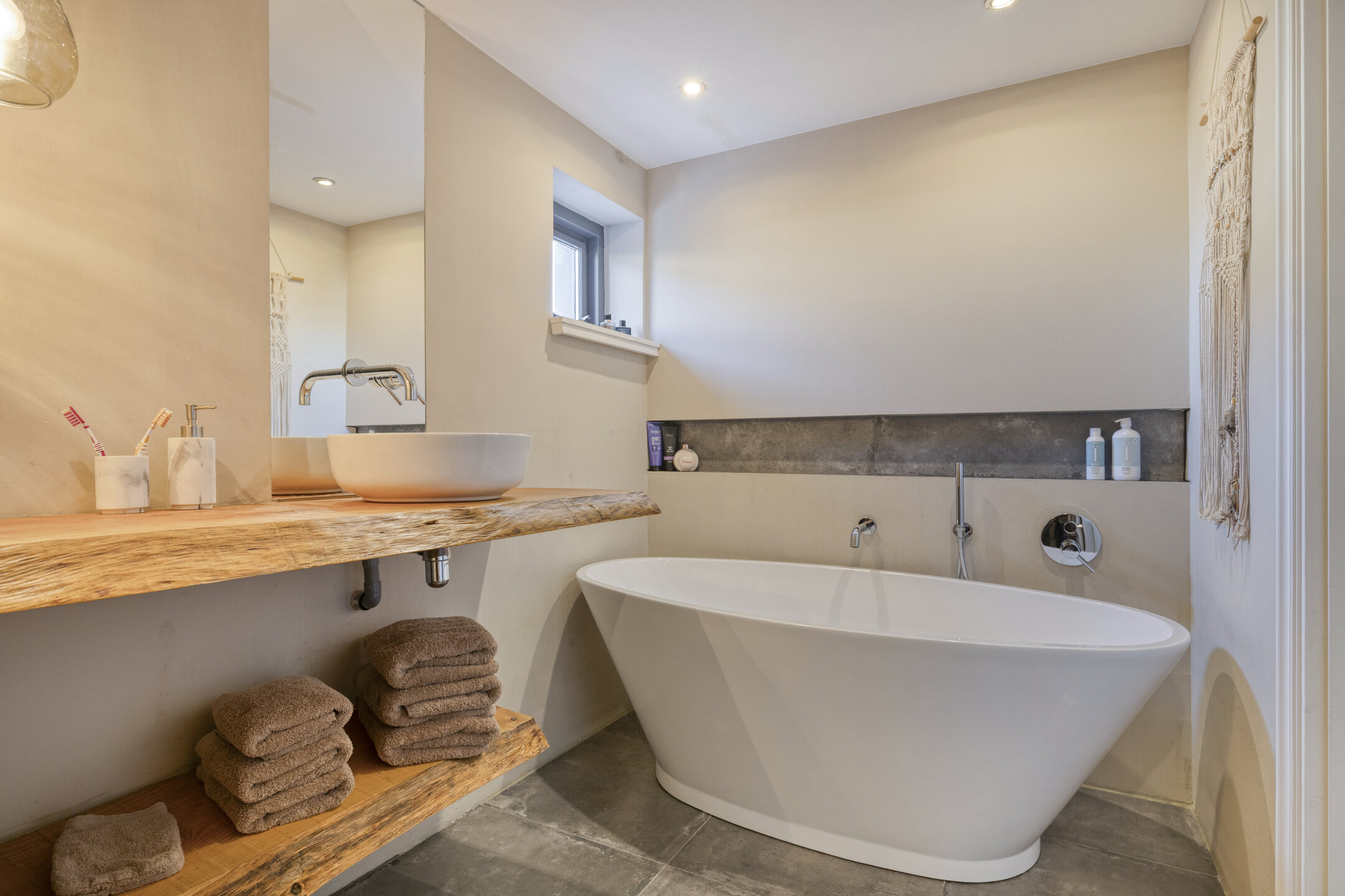 De slaapkamer op de begane grond beschikt over vloerverwarming en airconditioning, en grenst aan een moderne badkamer met inloopdouche, vrijstaand ligbad en waskom op een houten blad. Daarnaast is er een praktische wasruimte aanwezig.