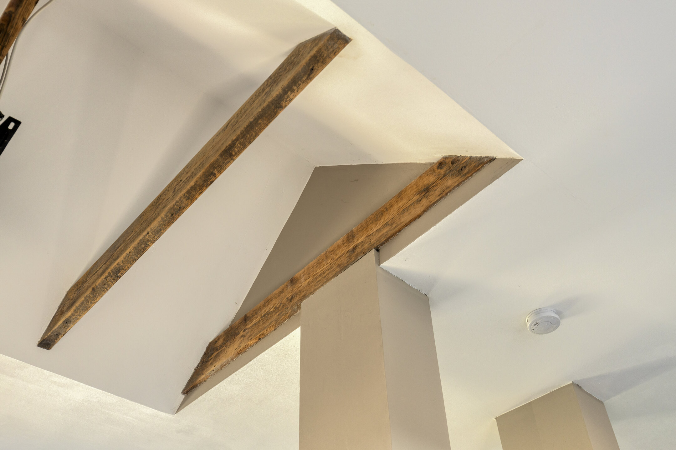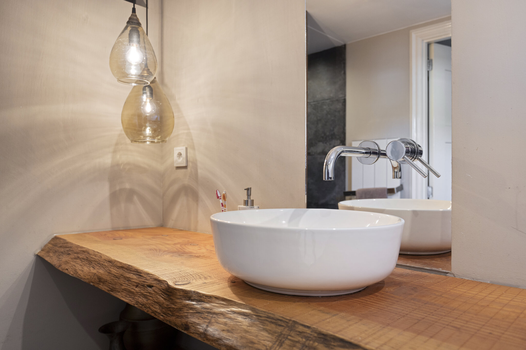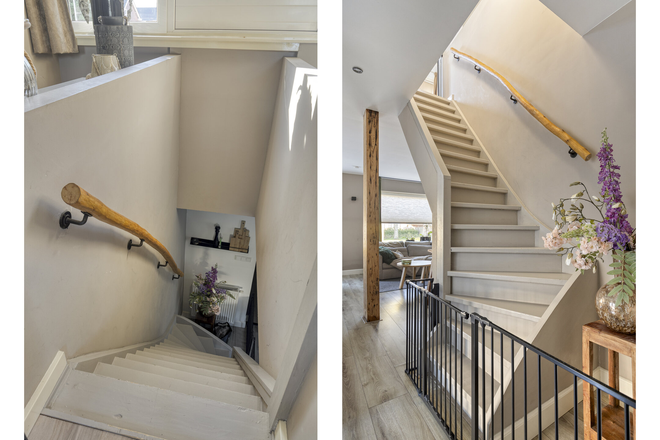 De wanden en plafonds zijn strak gestuct, de laminaatvloer loopt door over de hele begane grond en de grote raampartijen zorgen voor een heerlijke lichtinval. De originele houten balken geven de ruimte karakter, terwijl de wandlampen en vloerverwarming (in badkamer, toilet en slaapkamer) zorgen voor extra comfort.